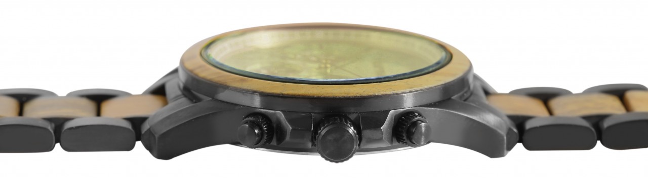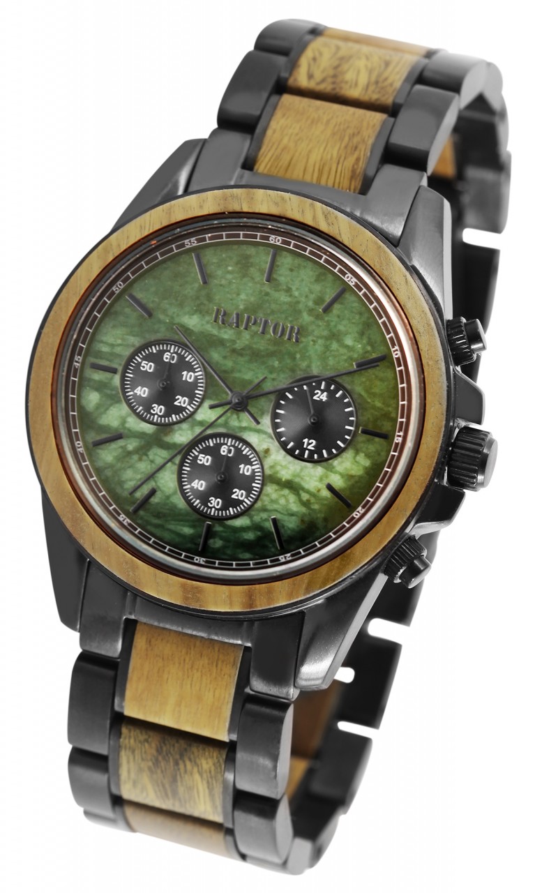 O cronógrafo masculino analógico de 3 ponteiros da Raptor possui um movimento de quartzo de alta qualidade. A pulseira de elos tem 22 mm de largura na alça e é feita de dois materiais. As bordas externas dos elementos são de aço inoxidável e a peça intermediária é de madeira. A pulseira do relógio pode ser aberta e fechada com um fecho dobrável tipo borboleta em aço inoxidável. O comprimento total do relógio é de 21 cm. A caixa de aço inoxidável com moldura de madeira tem um diâmetro de 42 mm e uma altura de 11 mm. O fundo da caixa também é feito de aço inoxidável. Você pode parar o tempo com o cronógrafo. Isto pode então ser lido nos totalizadores às seis e nove horas. O relógio também possui um display de 24 horas às três horas. O mostrador é feito de mármore e possui uma divisão clara e concisa.