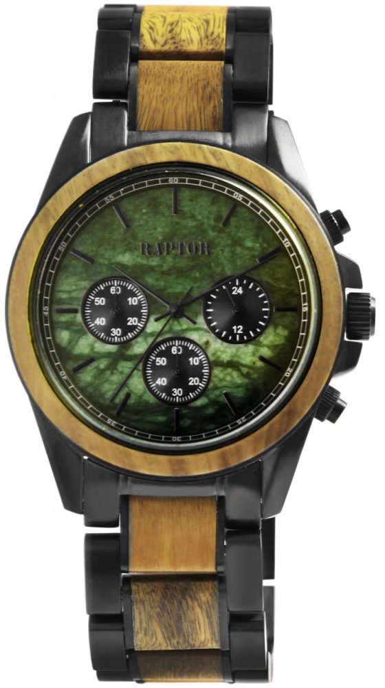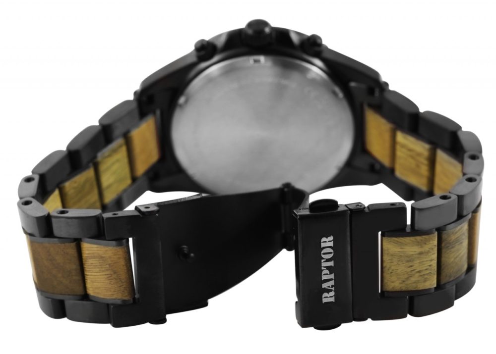 O cronógrafo masculino analógico de 3 ponteiros da Raptor possui um movimento de quartzo de alta qualidade. A pulseira de elos tem 22 mm de largura na alça e é feita de dois materiais. As bordas externas dos elementos são de aço inoxidável e a peça intermediária é de madeira. A pulseira do relógio pode ser aberta e fechada com um fecho dobrável tipo borboleta em aço inoxidável. O comprimento total do relógio é de 21 cm. A caixa de aço inoxidável com moldura de madeira tem um diâmetro de 42 mm e uma altura de 11 mm. O fundo da caixa também é feito de aço inoxidável. Você pode parar o tempo com o cronógrafo. Isto pode então ser lido nos totalizadores às seis e nove horas. O relógio também possui um display de 24 horas às três horas. O mostrador é feito de mármore e possui uma divisão clara e concisa.