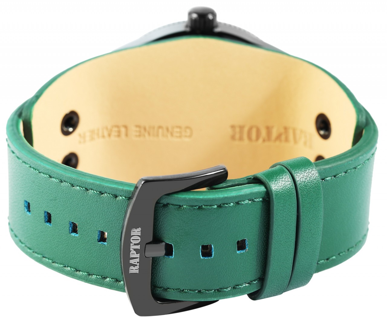 O relógio analógico masculino de 3 ponteiros da marca Raptor possui um movimento de quartzo preciso e de alta qualidade. A bracelete de pele genuína tem 24 mm de largura na alça e pode ser aberta e fechada usando uma fivela de aço inoxidável. Devido à base da bracelete, o visual do relógio se destaca e evita-se o contato direto entre a caixa do relógio e a pele, tornando este relógio ideal para peles sensíveis. O comprimento total do relógio é de 26 cm. A caixa de aço inoxidável com moldura esportiva tem um diâmetro de 46 mm e uma altura de 13 mm. O fundo da caixa também é feito de aço inoxidável. O mostrador claro com índices de linha permite ler a hora atual de forma rápida e fácil.