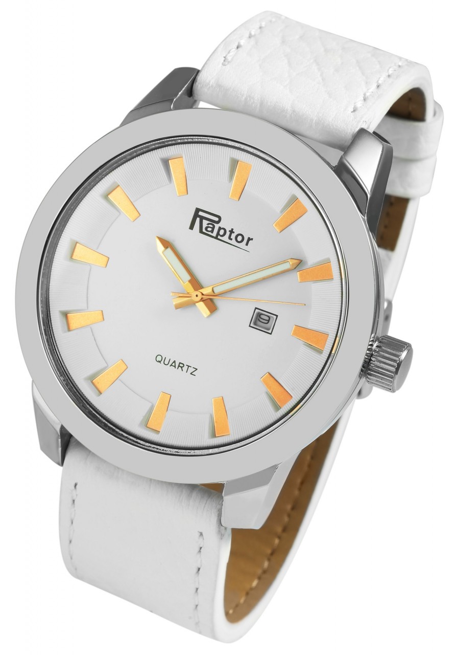 O relógio analógico masculino da marca Raptor possui movimento de quartzo da marca Miyota. O nome do modelo é RA238. A bracelete superior em pele genuína/parte inferior em pele sintética tem 24 mm de largura e abre com uma fivela de pino. O comprimento total é de 23 cm. A caixa de aço mineral com vidro mineral tem dimensão de 50 mm e altura de caixa de 13 mm. A tampa da caixa é feita de aço inoxidável.