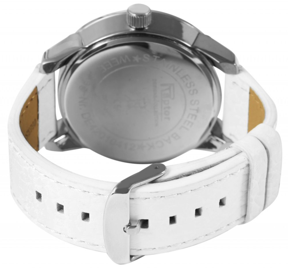 O relógio analógico masculino da marca Raptor possui movimento de quartzo da marca Miyota. O nome do modelo é RA238. A bracelete superior em pele genuína/parte inferior em pele sintética tem 24 mm de largura e abre com uma fivela de pino. O comprimento total é de 23 cm. A caixa de aço mineral com vidro mineral tem dimensão de 50 mm e altura de caixa de 13 mm. A tampa da caixa é feita de aço inoxidável.