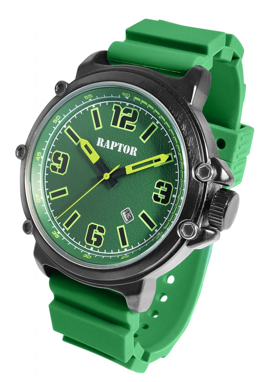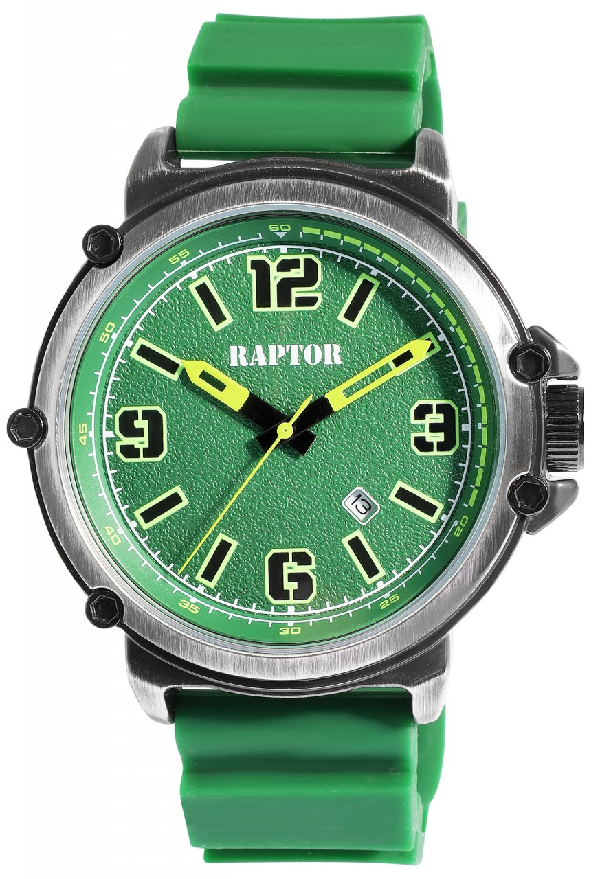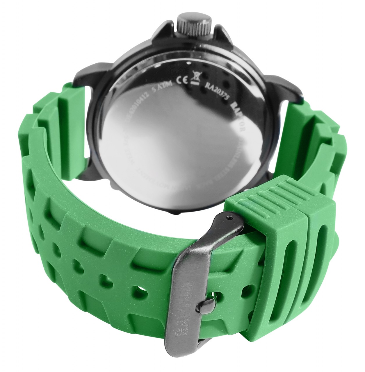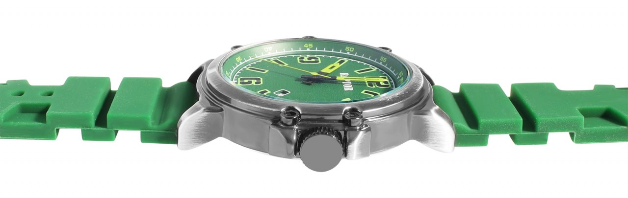 O relógio masculino Raptor com pulseira de silicone é uma poderosa declaração de dinamismo. Com um comprimento total de 24,5 cm e um impressionante diâmetro de caixa de 48 mm. A altura da caixa de 12 mm e a largura da bracelete de 22 mm conferem-lhe uma presença impressionante no pulso e definem detalhes poderosos.