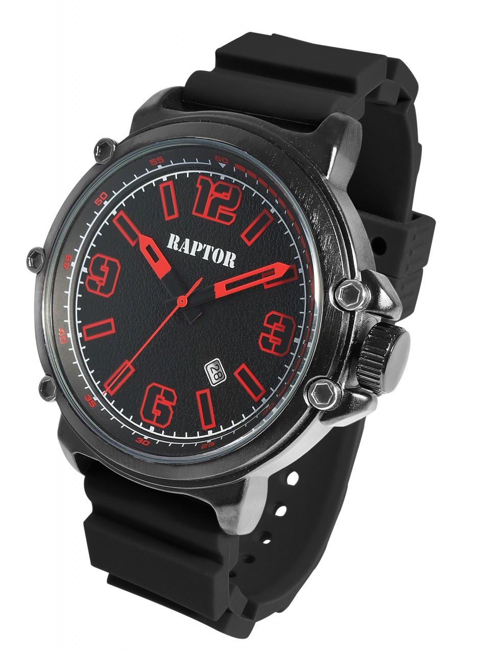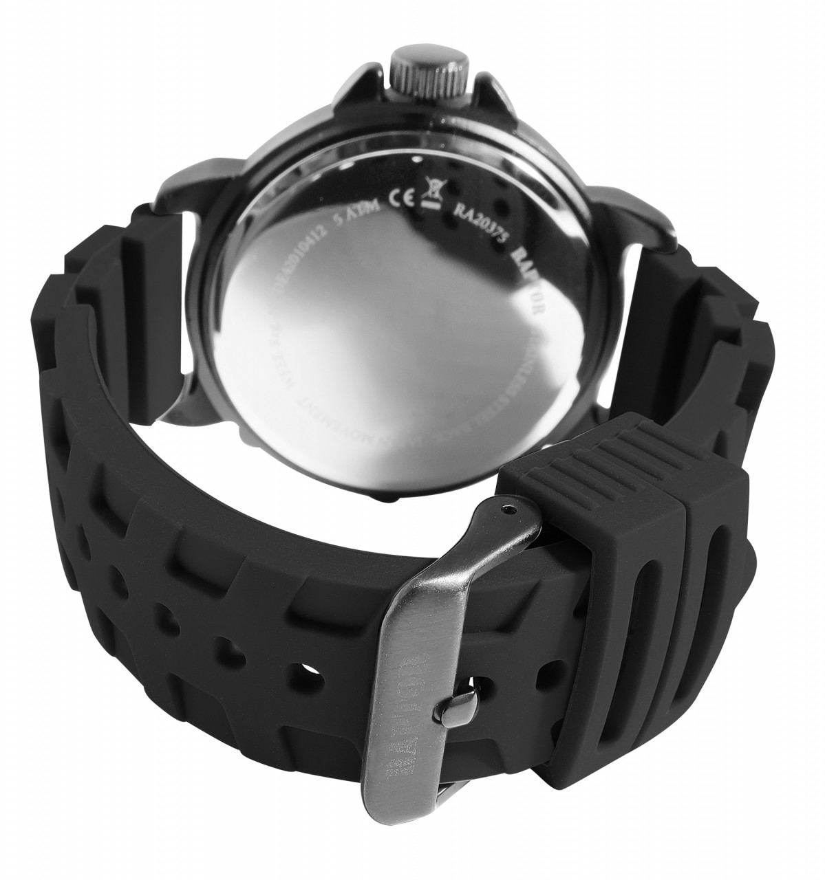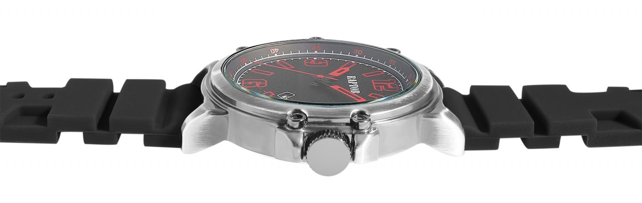O relógio masculino Raptor com pulseira de silicone é uma poderosa declaração de dinamismo. Com um comprimento total de 24,5 cm e um impressionante diâmetro de caixa de 48 mm, é uma expressão ousada de força e autoconfiança. A altura da caixa de 12 mm e a largura da bracelete de 22 mm conferem-lhe uma presença impressionante no pulso e definem detalhes poderosos.