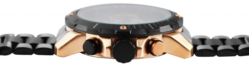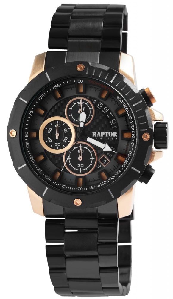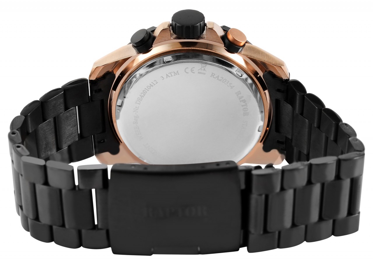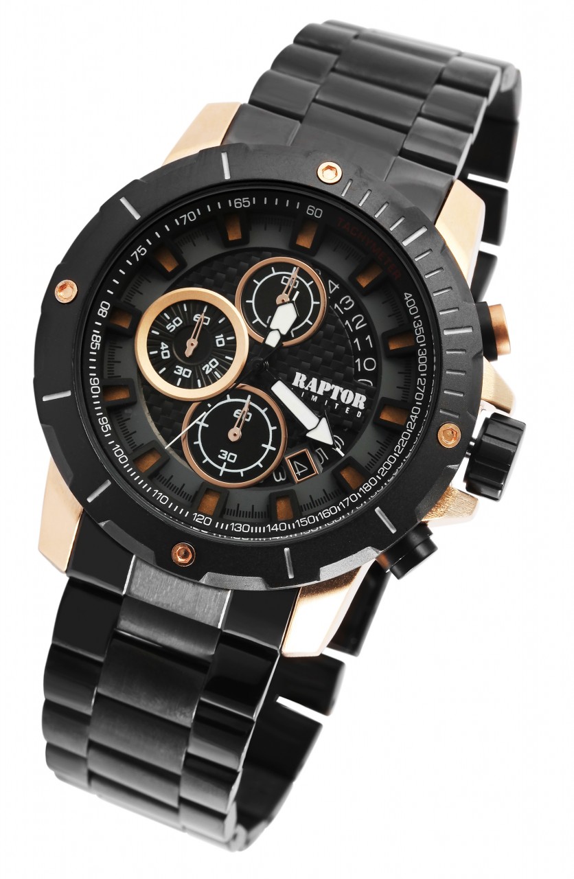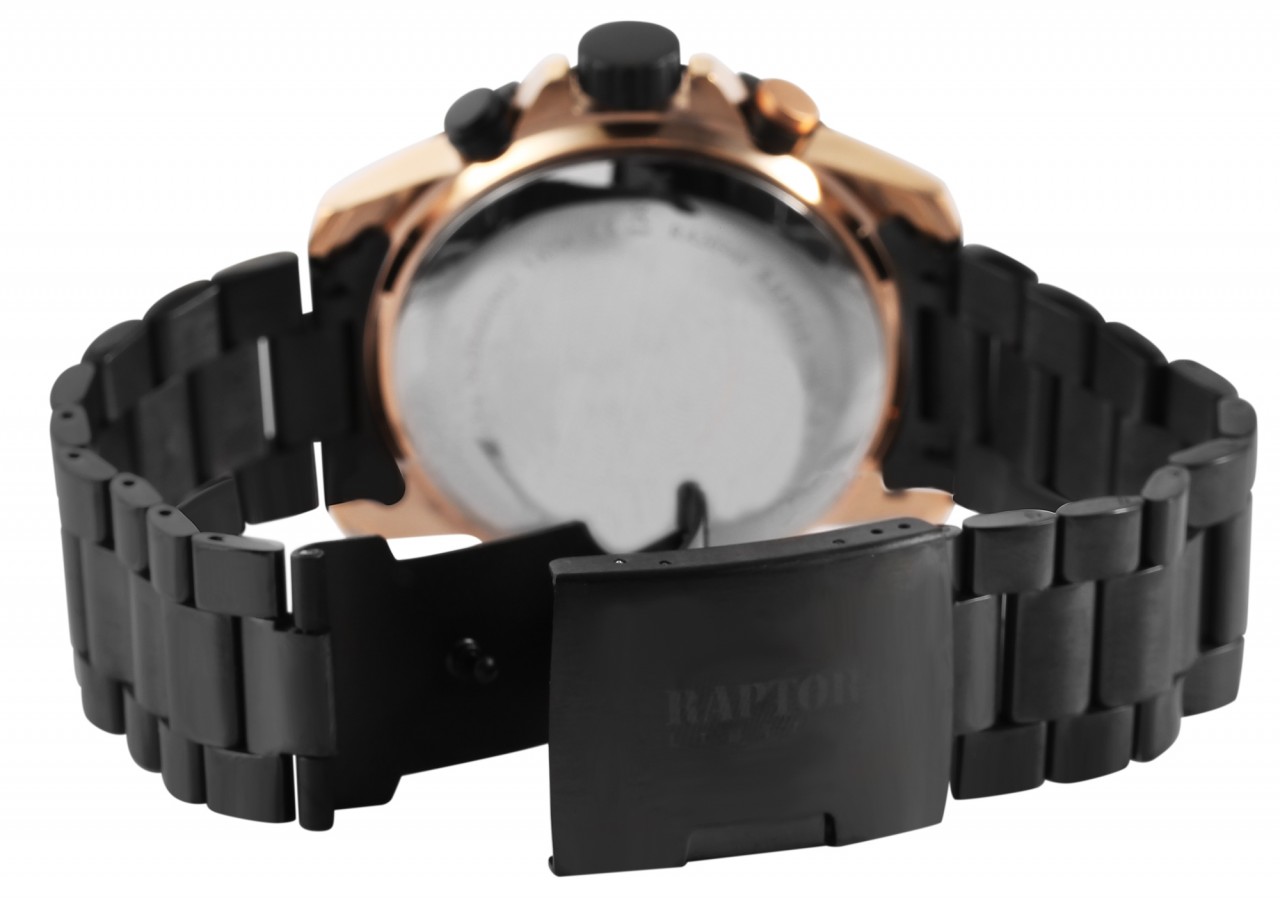 O Raptor Limited Chronograph “Kifah” impressiona não só pelo seu design marcante, mas também pela sua funcionalidade. A peça central deste relógio de homem é o movimento de quartzo de alta qualidade, que não só representa uma precisão inigualável, como também garante fiabilidade e longevidade. O mostrador analógico com três ponteiros e índices graduados, bem como três totalizadores às seis, nove e doze horas, conferem ao cronógrafo uma estética clara e de fácil leitura. A bracelete de elos em aço inoxidável não é apenas uma expressão de robustez, mas também de um visual requintado. O comprimento total de 24 cm garante um ajuste confortável e os elementos encurtáveis permitem personalizar a bracelete. A caixa metálica tem um aspeto marcante com um diâmetro de 47 mm e uma altura de 14,5 mm. O vidro mineral protege o mostrador…