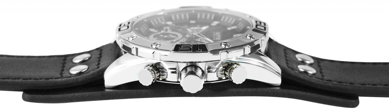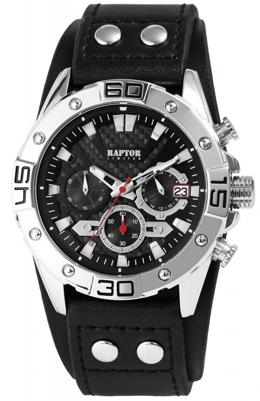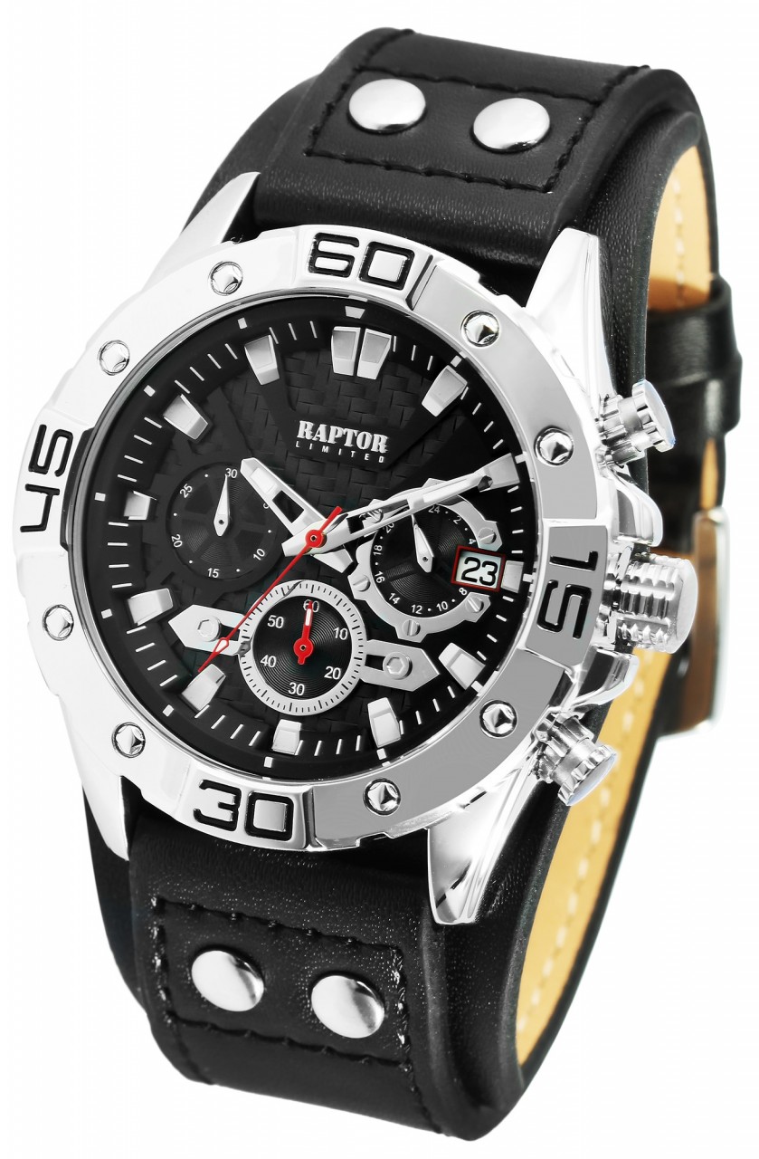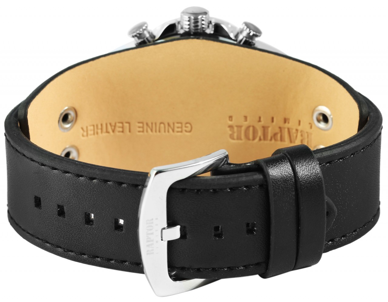 O cronógrafo analógico de 3 ponteiros para homem da marca Raptor possui um movimento de quartzo de alta qualidade e precisão. A bracelete em pele tem 24 mm de largura na extremidade e pode ser aberta e fechada com uma fivela de aço inoxidável. O revestimento da bracelete realça o aspeto do relógio e evita que a caixa do relógio entre em contacto direto com a pele, o que torna este relógio ideal para peles sensíveis. O comprimento total do relógio é de 26 cm. A caixa metálica com uma luneta rotativa desportiva tem um diâmetro de 46 mm e uma altura de 12,5 mm. O fundo da caixa é também em aço inoxidável. O cronógrafo pode ser utilizado para parar o tempo. Este pode então ser lido nos totalizadores às seis e nove horas. O relógio também tem uma data e uma indicação de 24 horas às três horas.