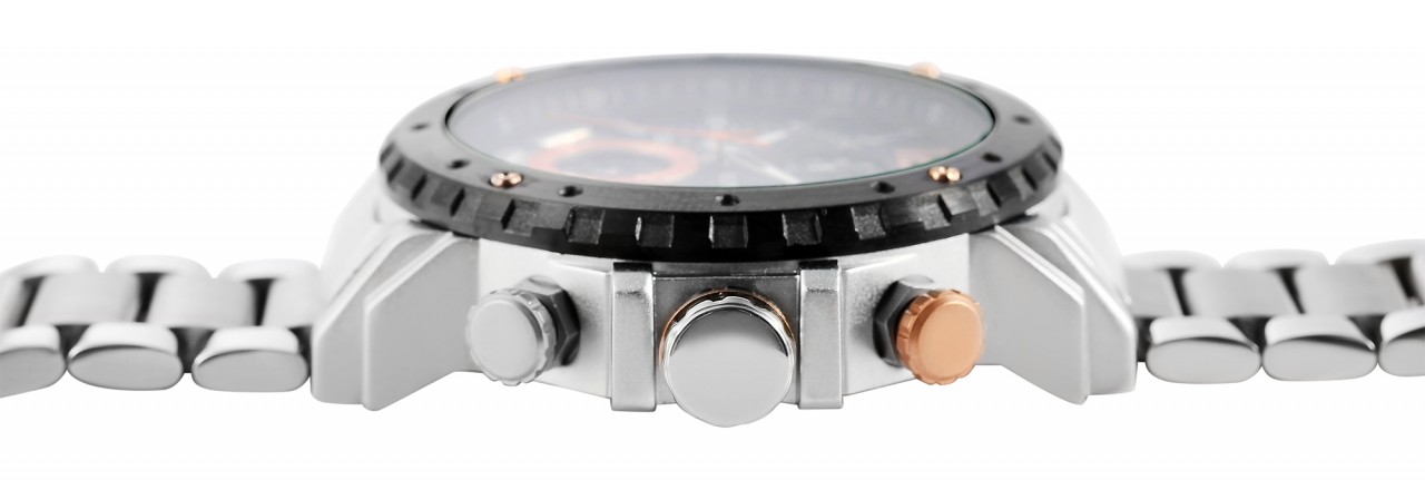 O cronógrafo masculino da marca Raptor possui movimento de quartzo de alta qualidade. A pulseira de aço inoxidável tem 25 mm de largura na alça e pode ser aberta e fechada com um fecho dobrável. O comprimento total do relógio é de 24,5 cm. A caixa de metal com vidro mineral tem um diâmetro de 48 mm e uma altura de 13 mm. O fundo da caixa é feito de aço inoxidável. O tempo pode ser parado com o cronógrafo e depois lido nos três totalizadores às seis, nove e doze horas. O relógio também possui uma exibição de data entre duas e cinco…