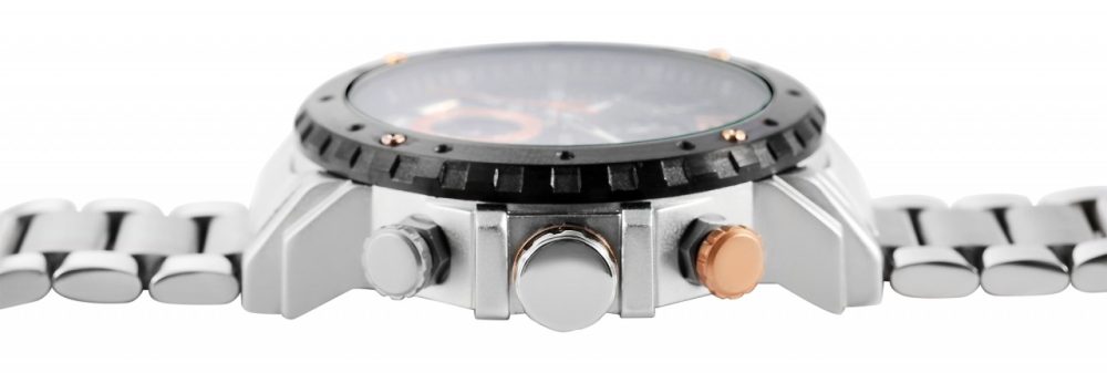 O cronógrafo masculino da marca Raptor possui movimento de quartzo de alta qualidade. A pulseira de aço inoxidável tem 25 mm de largura na alça e pode ser aberta e fechada com um fecho dobrável. O comprimento total do relógio é de 24,5 cm. A caixa de metal com vidro mineral tem um diâmetro de 48 mm e uma altura de 13 mm. O fundo da caixa é feito de aço inoxidável. O tempo pode ser parado com o cronógrafo e depois lido nos três totalizadores às seis, nove e doze horas. O relógio também possui uma exibição de data entre duas e cinco…