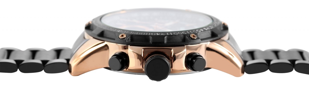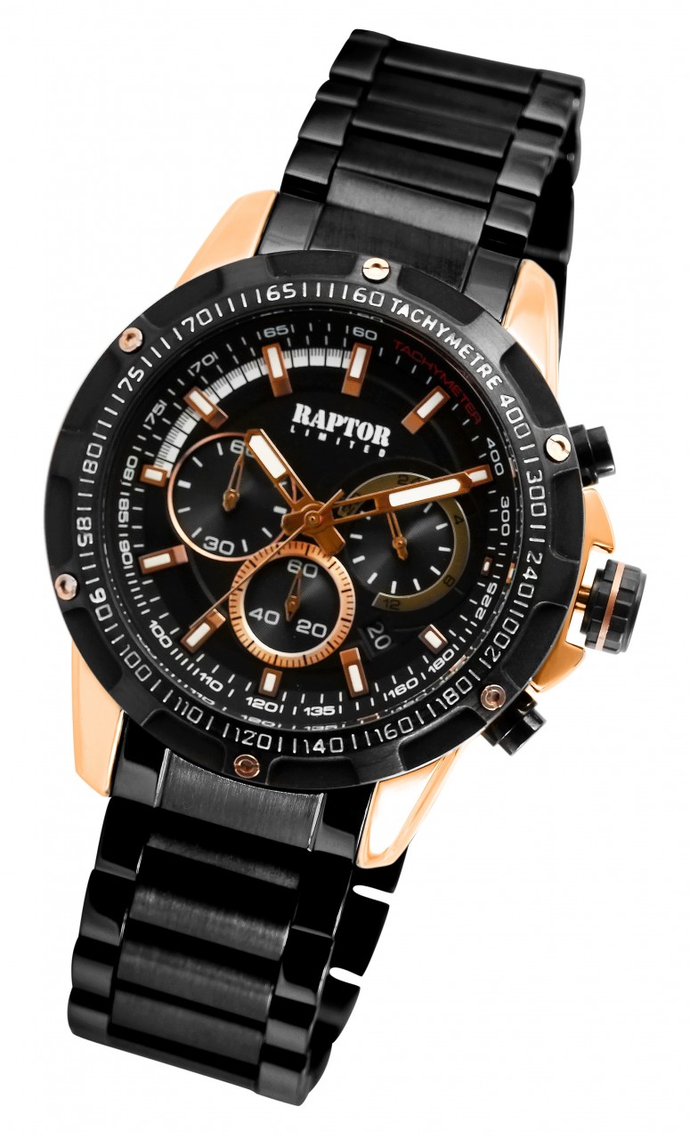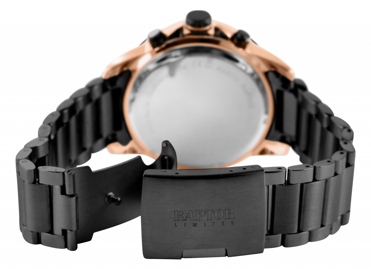 O Raptor Limited Chronograph "Omran" impressiona não só pelo seu design marcante, mas também pela sua funcionalidade. A peça central deste relógio de homem é o movimento de quartzo de alta qualidade, que não só representa uma precisão inigualável, como também garante fiabilidade e longevidade. O mostrador analógico com três ponteiros e índices graduados, bem como três totalizadores às três, seis e nove horas, conferem ao cronógrafo uma estética clara e de fácil leitura. A bracelete de elos em aço inoxidável não é apenas uma expressão de robustez, mas também de um visual requintado. O comprimento total de 24 cm garante um ajuste confortável e os elementos encurtáveis permitem personalizar a bracelete. A caixa metálica tem um aspeto marcante com…