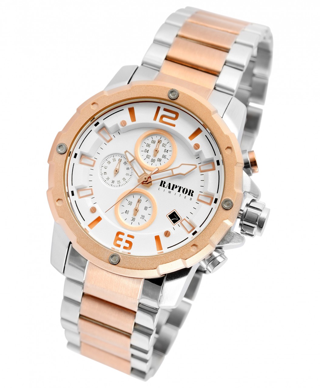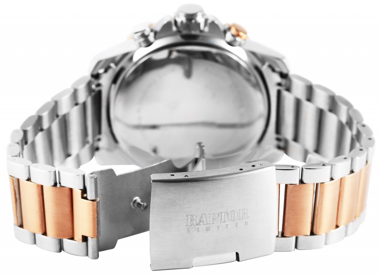 O cronógrafo masculino da marca Raptor possui movimento de quartzo de alta qualidade. A pulseira de aço inoxidável tem 23 mm de largura na alça e pode ser aberta e fechada com um fecho dobrável. O comprimento total do relógio é de 22,5 cm. A caixa de metal com vidro mineral tem um diâmetro de 47 mm e uma altura de 13 mm. O fundo da caixa é feito de aço inoxidável. O tempo pode ser parado com o cronógrafo e depois lido nos três totalizadores às seis, nove e doze horas. O relógio também possui uma exibição de data às quatro horas.