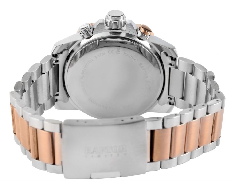 O cronógrafo masculino da marca Raptor possui movimento de quartzo de alta qualidade. A pulseira de aço inoxidável tem 23 mm de largura na alça e pode ser aberta e fechada com um fecho dobrável. O comprimento total do relógio é de 22,5 cm. A caixa de metal com vidro mineral tem um diâmetro de 47 mm e uma altura de 13 mm. O fundo da caixa é feito de aço inoxidável. O tempo pode ser parado com o cronógrafo e depois lido nos três totalizadores às seis, nove e doze horas. O relógio também possui uma exibição de data às quatro horas.