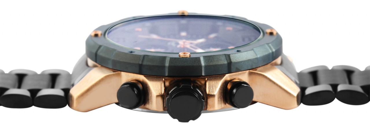 O cronógrafo masculino da marca Raptor possui movimento de quartzo de alta qualidade. A pulseira de aço inoxidável tem 23 mm de largura na alça e pode ser aberta e fechada com um fecho dobrável. O comprimento total do relógio é de 22,5 cm. A caixa de metal com vidro mineral tem um diâmetro de 47 mm e uma altura de 13 mm. O fundo da caixa é feito de aço inoxidável. O tempo pode ser parado com o cronógrafo e depois lido nos três totalizadores às seis, nove e doze horas. O relógio também possui uma exibição de data às quatro horas. Os ponteiros e índices revestidos com Superluminova facilitam a leitura das horas, mesmo no escuro. Além disso, o relógio masculino tem resistência à água de 3 bar. No geral, este relógio é um cronômetro esportivo e um ótimo companheiro para a vida cotidiana.