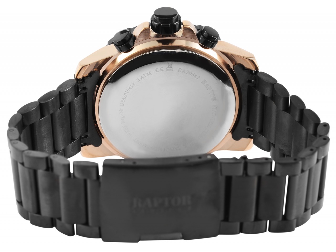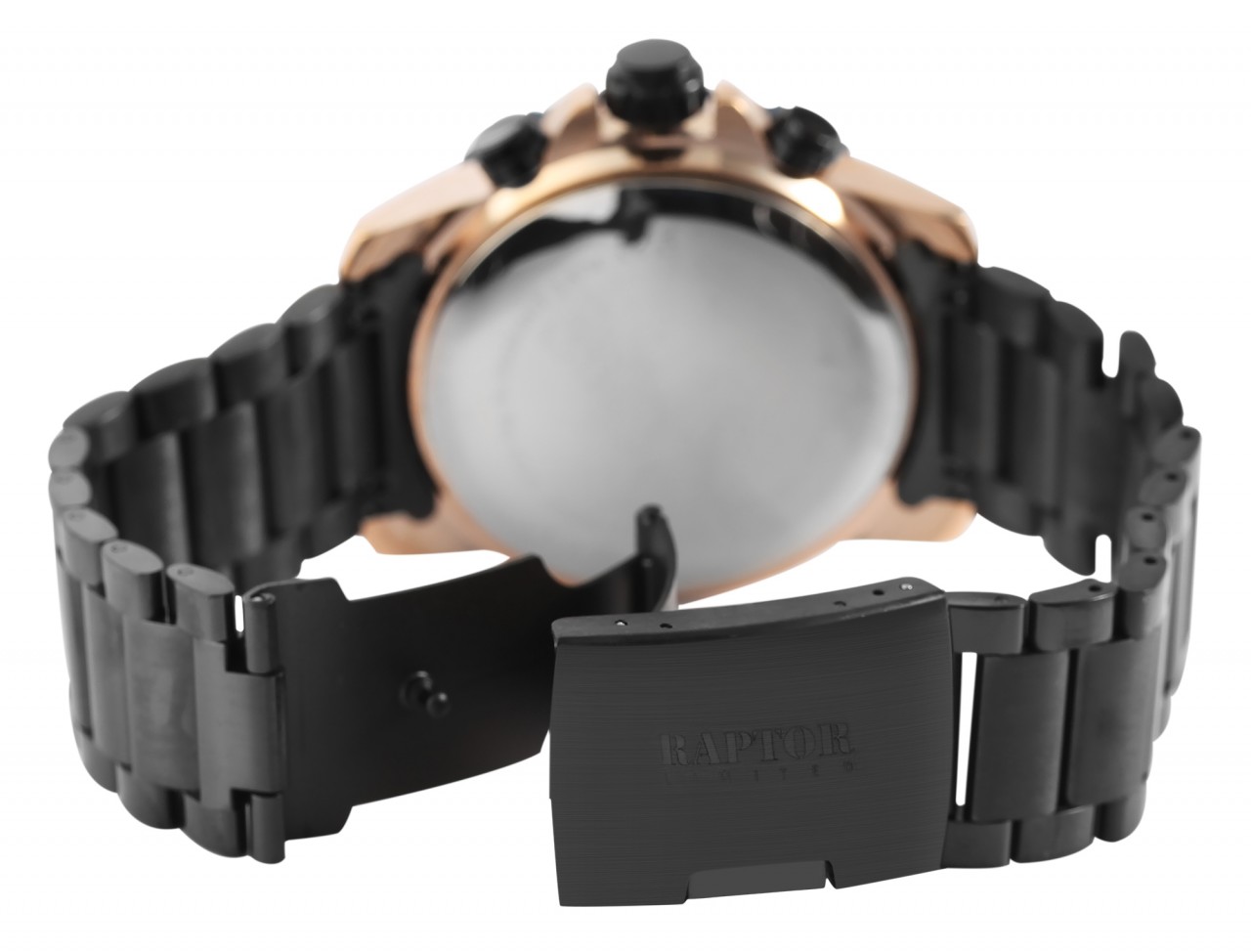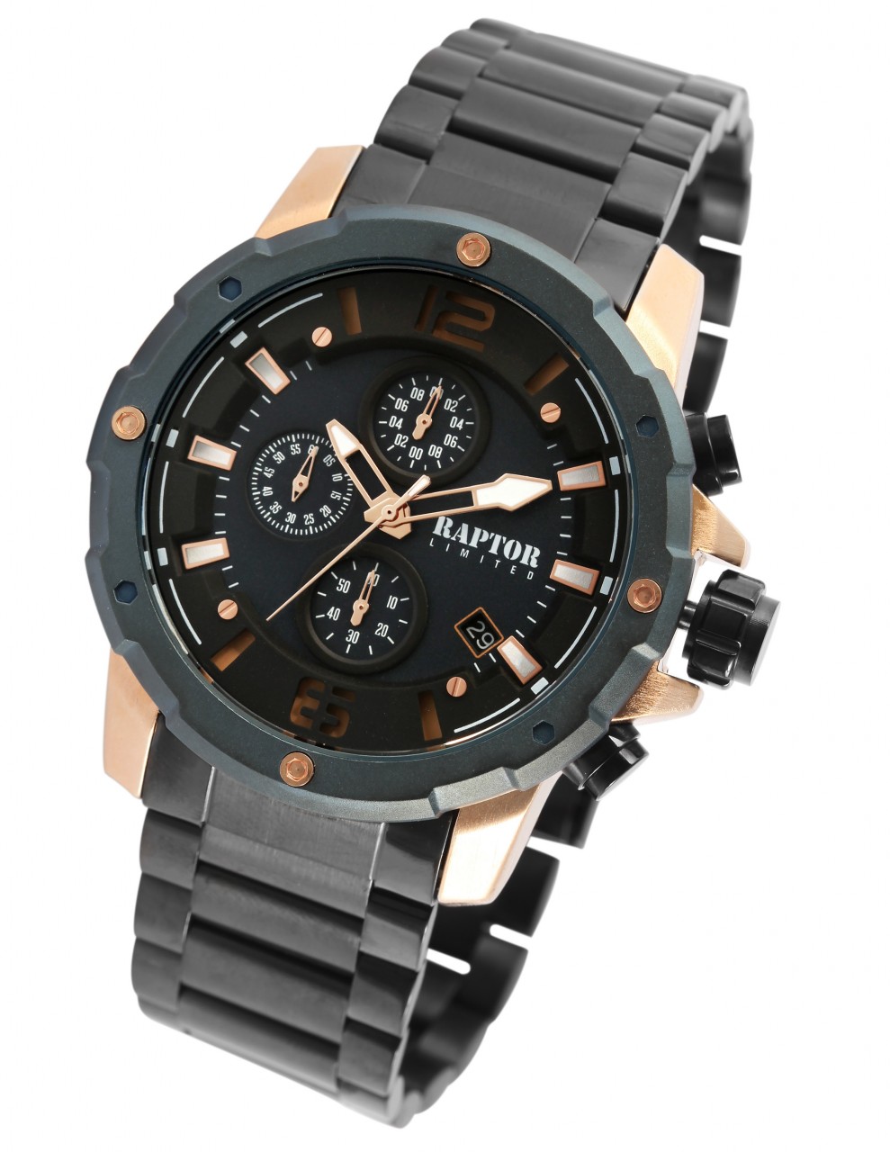 O cronógrafo masculino da marca Raptor possui movimento de quartzo de alta qualidade. A pulseira de aço inoxidável tem 23 mm de largura na alça e pode ser aberta e fechada com um fecho dobrável. O comprimento total do relógio é de 22,5 cm. A caixa de metal com vidro mineral tem um diâmetro de 47 mm e uma altura de 13 mm. O fundo da caixa é feito de aço inoxidável. O tempo pode ser parado com o cronógrafo e depois lido nos três totalizadores às seis, nove e doze horas. O relógio também possui uma exibição de data às quatro horas.