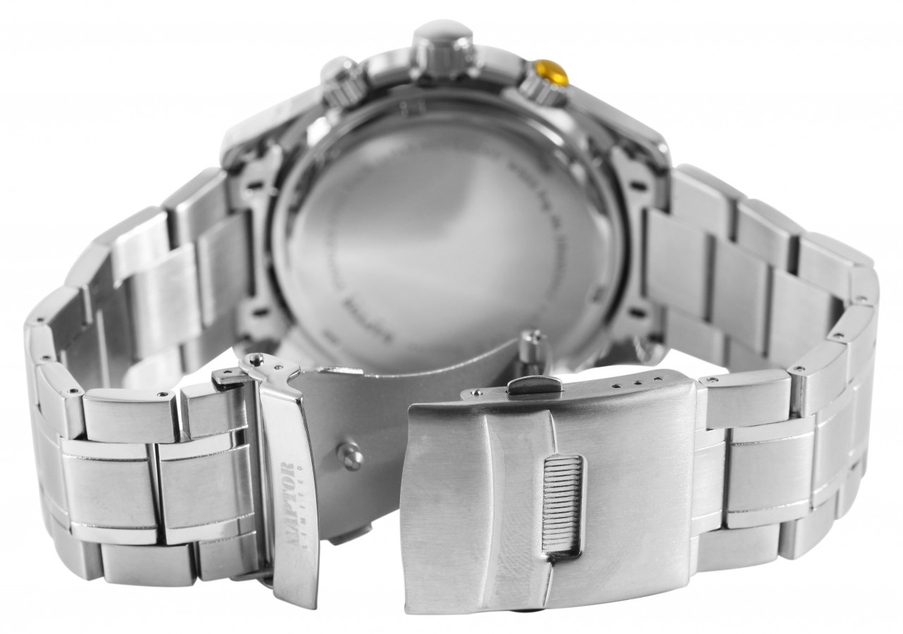 O relógio de pulso analógico de 3 ponteiros para homem da marca Raptor possui um movimento de quartzo de alta qualidade. A bracelete em aço inoxidável tem 22 mm de largura na extremidade e pode ser aberta e fechada com um fecho desdobrável. O comprimento total do relógio é de 20,5 cm. A caixa metálica tem um diâmetro de 45 mm e uma altura de 13 mm. O relógio possui também uma indicação de 24 horas, uma indicação da data e uma indicação do dia da semana. Graças aos ponteiros e índices revestidos a Superluminova, a hora também é fácil de ler no escuro. Este relógio desportivo tornar-se-á rapidamente parte integrante do seu pulso. Receberá um cartão de garantia e uma caixa original Raptor como acessórios para o seu produto.