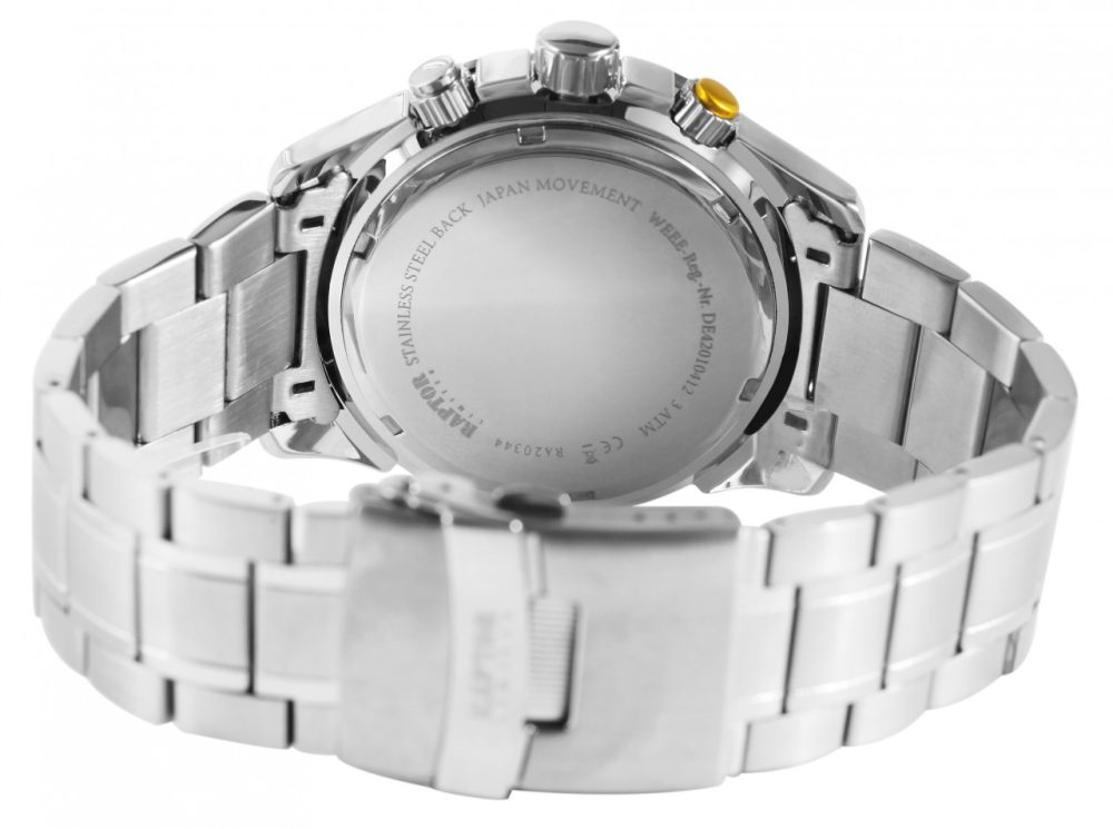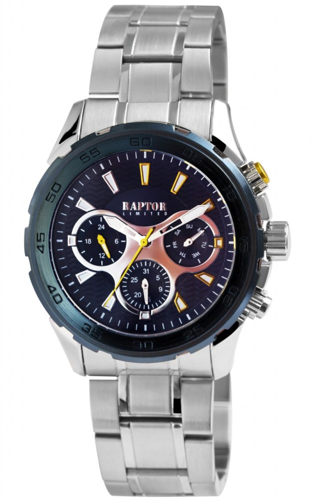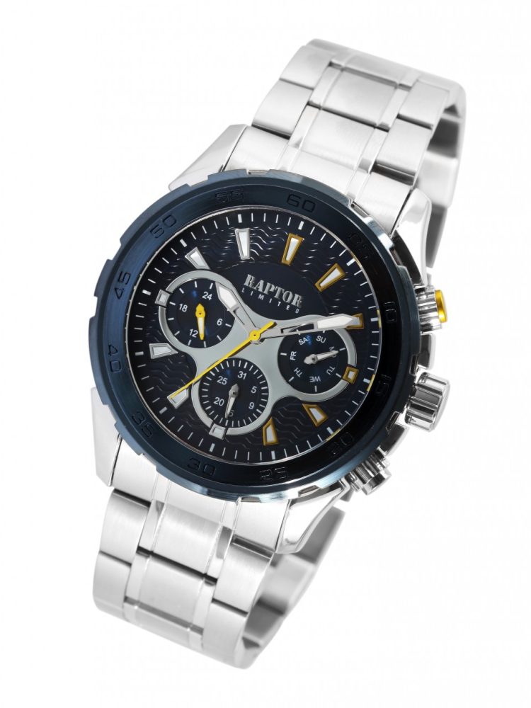 O relógio de pulso analógico de 3 ponteiros para homem da marca Raptor possui um movimento de quartzo de alta qualidade. A bracelete em aço inoxidável tem 22 mm de largura na extremidade e pode ser aberta e fechada com um fecho desdobrável. O comprimento total do relógio é de 20,5 cm. A caixa metálica tem um diâmetro de 45 mm e uma altura de 13 mm. O relógio possui também uma indicação de 24 horas, uma indicação da data e uma indicação do dia da semana. Graças aos ponteiros e índices revestidos a Superluminova, a hora também é fácil de ler no escuro. Este relógio desportivo tornar-se-á rapidamente parte integrante do seu pulso. Receberá um cartão de garantia e uma caixa original Raptor como acessórios para o seu produto.