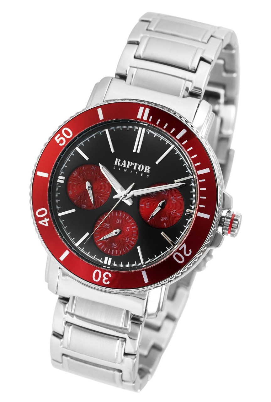 O relógio de pulso analógico masculino de 3 ponteiros da marca Raptor possui um movimento de quartzo de alta qualidade. A pulseira de aço inoxidável tem 20 mm de largura na alça e pode ser aberta e fechada usando um fecho dobrável de aço inoxidável. O comprimento total do relógio é de 24,5 cm. A caixa de metal com vidro mineral tem um diâmetro de 42 mm e uma altura de 11 mm. O relógio também possui exibição de 24 horas, exibição de data e exibição do dia da semana. O fundo da caixa é feito de aço inoxidável e o relógio tem resistência à água de 3 Bar. Os ponteiros revestidos com Superluminova facilitam a leitura das horas mesmo no escuro. Como acessórios do seu produto, você receberá um cartão de garantia e uma caixa original da marca Raptor.