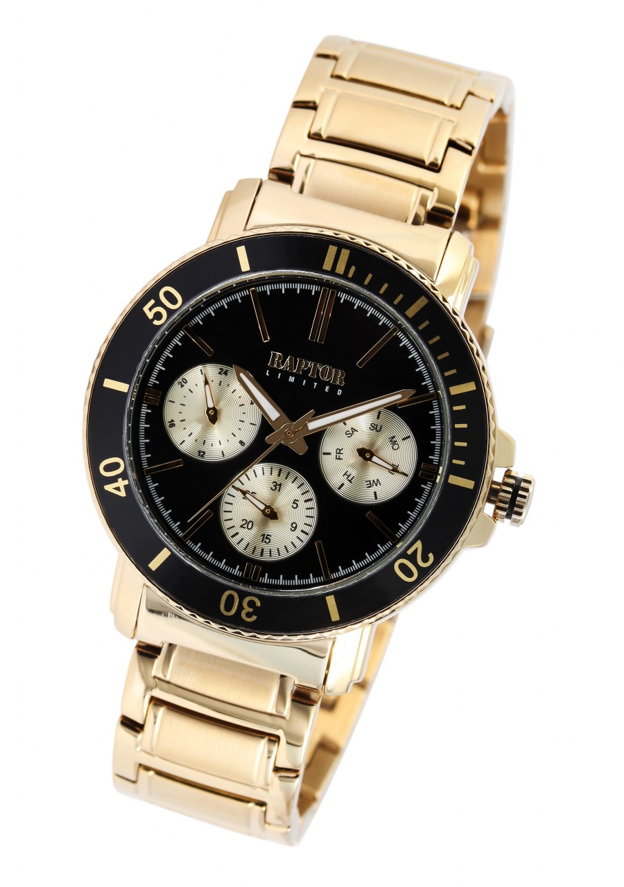 Die analoge 3-Zeiger Herrenarmbanduhr der Marke Raptor verfügt über ein hochwertiges Quarzuhrwerk. Das Edelstahlarmband ist am Anstoß 20 mm breit und lässt sich über eine Edelstahl-Faltschließe öffnen und schließen. Die Gesamtlänge der Uhr beträgt 24,5 cm. Das Metallgehäuse mit Mineralglas hat eine Abmessung von 42 mm im Durchmesser und einer Gehäusehöhe von 11 mm. Zudem verfügt die Uhr über eine 24 Stundenanzeige, Datumsanzeige und Wochentagsanzeige. Der Gehäuseboden ist aus Edelstahl gefertigt und die Uhr hat eine Wasserdichtigkeit von 3 Bar. Durch die mit Superluminova beschichteten Zeiger lässt sich auch im Dunkeln die Zeit gut ablesen. Als Zubehör zu Ihrem Produkt erhalten Sie eine Garantiekarte und eine Originalbox der Marke Raptor.