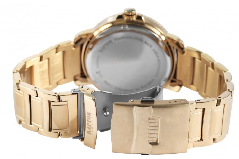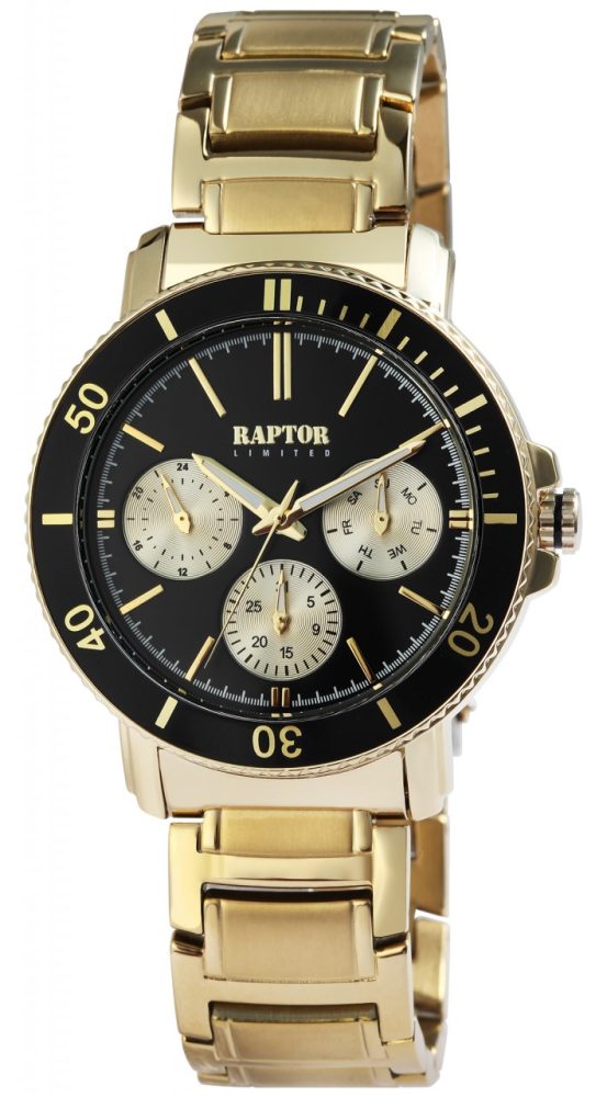 Die analoge 3-Zeiger Herrenarmbanduhr der Marke Raptor verfügt über ein hochwertiges Quarzuhrwerk. Das Edelstahlarmband ist am Anstoß 20 mm breit und lässt sich über eine Edelstahl-Faltschließe öffnen und schließen. Die Gesamtlänge der Uhr beträgt 24,5 cm. Das Metallgehäuse mit Mineralglas hat eine Abmessung von 42 mm im Durchmesser und einer Gehäusehöhe von 11 mm. Zudem verfügt die Uhr über eine 24 Stundenanzeige, Datumsanzeige und Wochentagsanzeige. Der Gehäuseboden ist aus Edelstahl gefertigt und die Uhr hat eine Wasserdichtigkeit von 3 Bar. Durch die mit Superluminova beschichteten Zeiger lässt sich auch im Dunkeln die Zeit gut ablesen. Als Zubehör zu Ihrem Produkt erhalten Sie eine Garantiekarte und eine Originalbox der Marke Raptor.