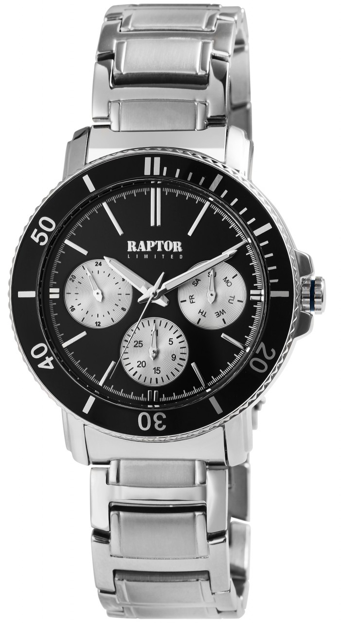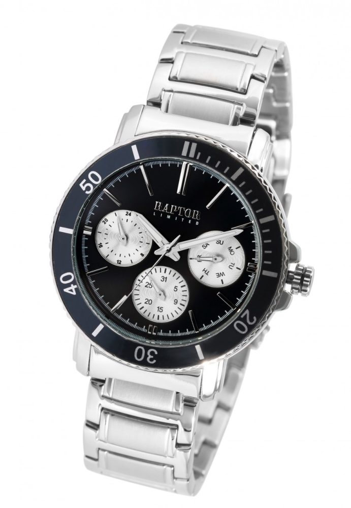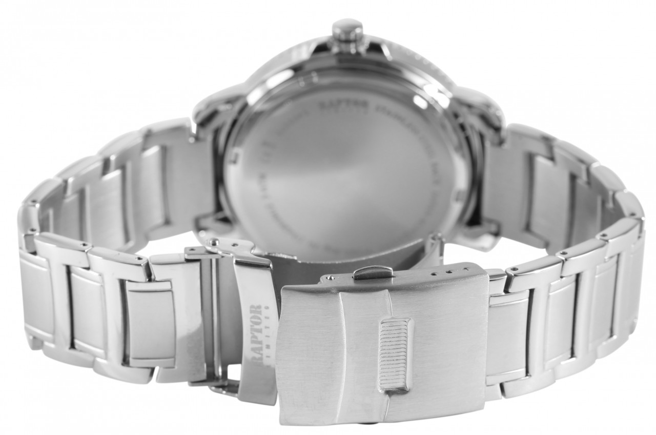 O relógio de pulso analógico de 3 ponteiros para homem da marca Raptor possui um movimento de quartzo de alta qualidade. A bracelete em aço inoxidável tem 20 mm de largura na extremidade e pode ser aberta e fechada com um fecho desdobrável em aço inoxidável. O comprimento total do relógio é de 24,5 cm. A caixa metálica com vidro mineral tem um diâmetro de 42 mm e uma altura de 11 mm. O relógio possui também uma indicação de 24 horas, uma indicação da data e uma indicação do dia da semana. O fundo da caixa é feito de aço inoxidável e o relógio tem uma resistência à água de 3 bar. Os ponteiros são revestidos com Superluminova, o que facilita a leitura das horas mesmo no escuro. Receberá um cartão de garantia e uma caixa original Raptor como acessórios para o seu produto.