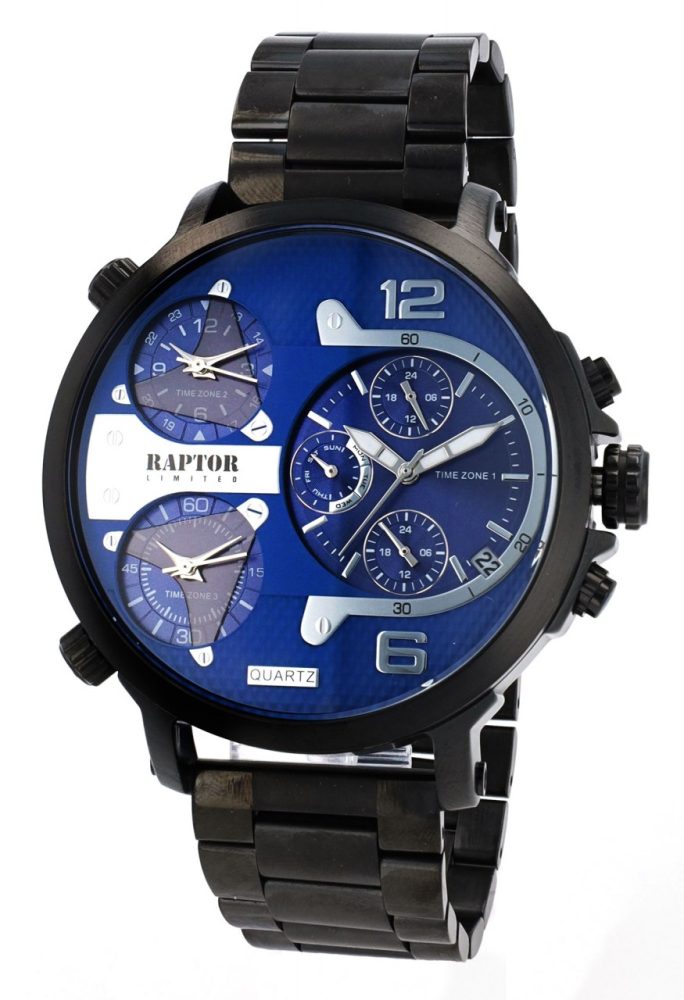 O relógio de pulso multifuncional masculino da marca Raptor possui 3 movimentos de quartzo de alta qualidade. O Miyota JP15 está instalado para o 1º fuso horário, o que significa que além da exibição normal de 12 horas, há uma exibição paralela de 24 horas (exibição superior descentralizada), uma exibição de data (entre 4 e 5 horas) , uma exibição do dia (exibição descentralizada esquerda) e outra exibição separada de 24 horas (exibição descentralizada inferior) decoram o mostrador. Um Miyota 2035 foi usado para o 2º e 3º fusos horários, resultando em duas exibições adicionais de 12 horas. O relógio também foi equipado com uma Pulseira em Aço Inoxidável. Tem 24 mm de largura na alça, diminui até 21 mm…