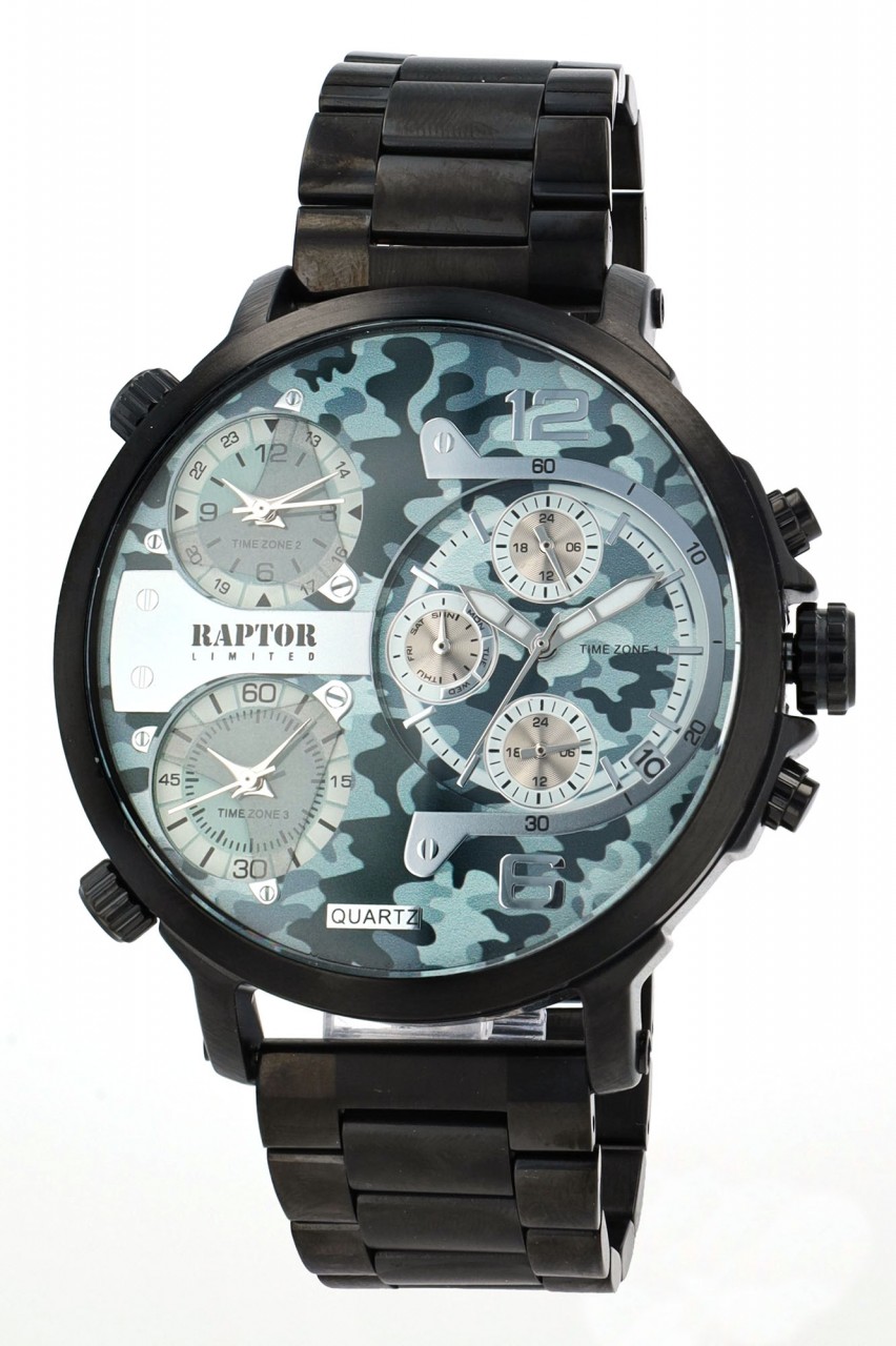 O relógio de pulso multifuncional masculino da marca Raptor possui 3 movimentos de quartzo de alta qualidade. O Miyota JP15 está instalado para o 1º fuso horário, o que significa que além da exibição normal de 12 horas, há uma exibição paralela de 24 horas (exibição superior descentralizada), uma exibição de data (entre 4 e 5 horas) , uma exibição do dia (exibição descentralizada esquerda) e outra exibição separada de 24 horas (exibição descentralizada inferior) decoram o mostrador. Um Miyota 2035 foi usado para o 2º e 3º fusos horários, resultando em duas exibições adicionais de 12 horas. O relógio também foi equipado com uma Pulseira em Aço Inoxidável. Tem 24 mm de largura na alça, diminui até 21 mm…