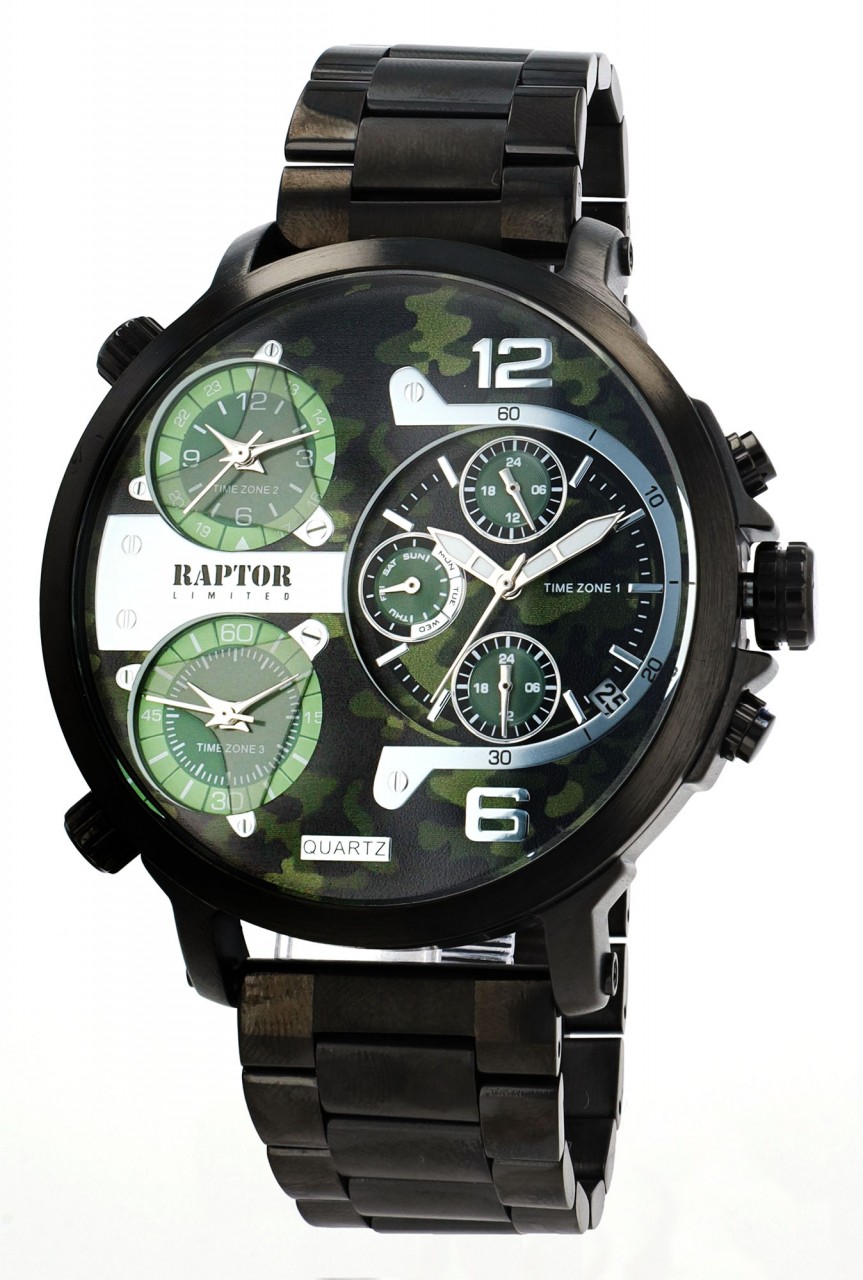 O relógio de pulso multifuncional masculino da marca Raptor possui 3 movimentos de quartzo de alta qualidade. O Miyota JP15 está instalado para o 1º fuso horário, o que significa que além da exibição normal de 12 horas, há uma exibição paralela de 24 horas (exibição superior descentralizada), uma exibição de data (entre 4 e 5 horas) , uma exibição do dia (exibição descentralizada esquerda) e outra exibição separada de 24 horas (exibição descentralizada inferior) decoram o mostrador. Um Miyota 2035 foi usado para o 2º e 3º fusos horários, resultando em duas exibições adicionais de 12 horas. O relógio também foi equipado com uma Pulseira em Aço Inoxidável. Tem 24 mm de largura na alça, diminui até 21 mm…