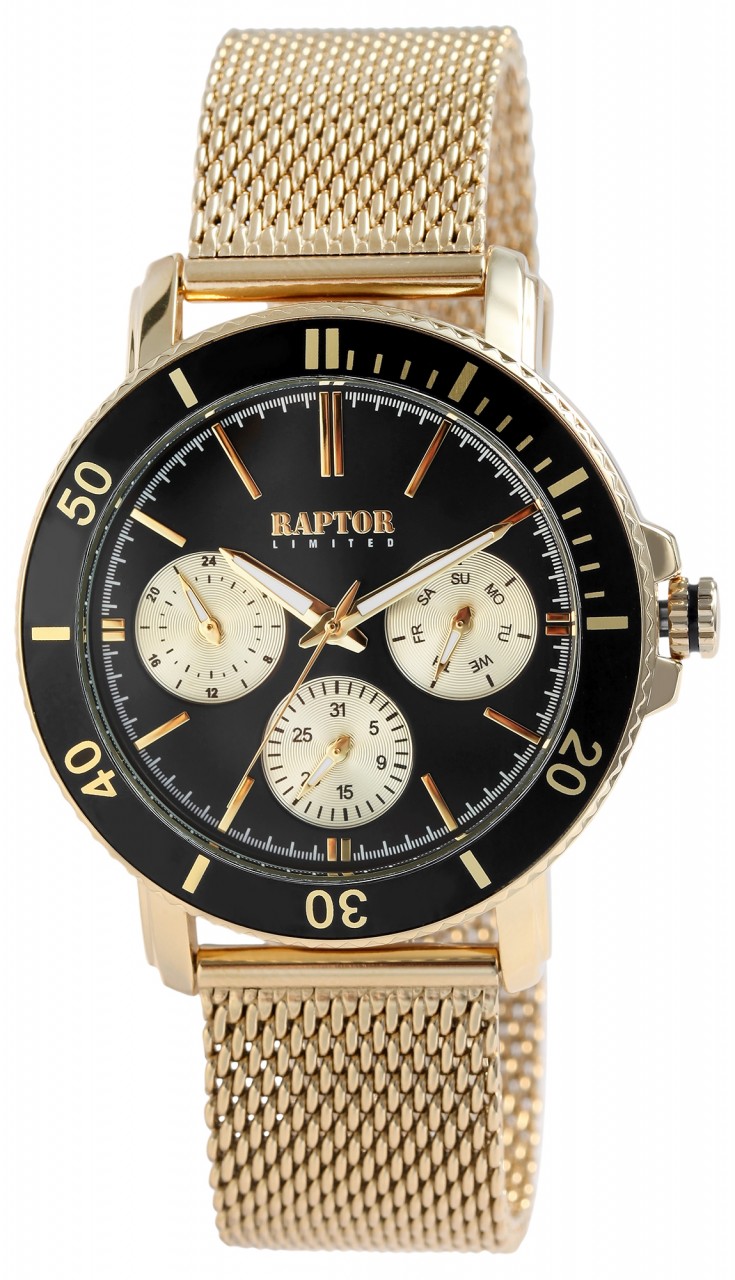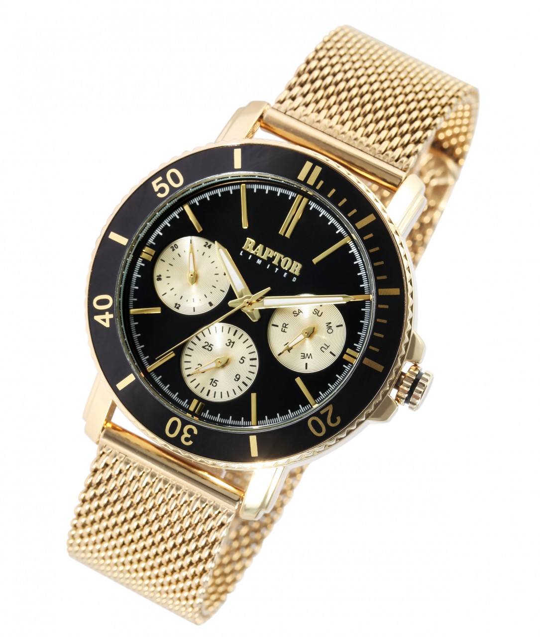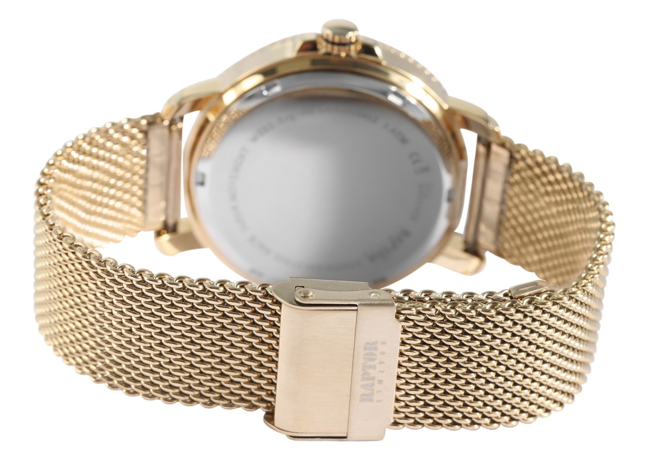 Design contemporâneo e funções práticas são o que obtém com o nosso relógio de homem Raptor Limited “Reda”. A peça central deste relógio de pulso é o movimento de quartzo de alta qualidade, que não só é sinónimo de precisão absoluta, mas também de fiabilidade e durabilidade. O mostrador analógico com três ponteiros e índices de linhas confere ao relógio um aspeto claro e de fácil leitura. A bracelete em malha de aço inoxidável não é apenas uma expressão de robustez, mas também de aparência elegante. Um prático ajustador de tamanho permite que a bracelete seja ajustada individualmente e o fecho de gancho garante um ajuste seguro e confortável. O comprimento total de 24,5 cm garante um ajuste cómodo. A caixa metálica tem um diâmetro de 42 mm e uma altura de 11 mm. O vidro mineral protege o mostrador