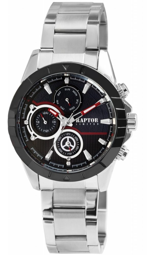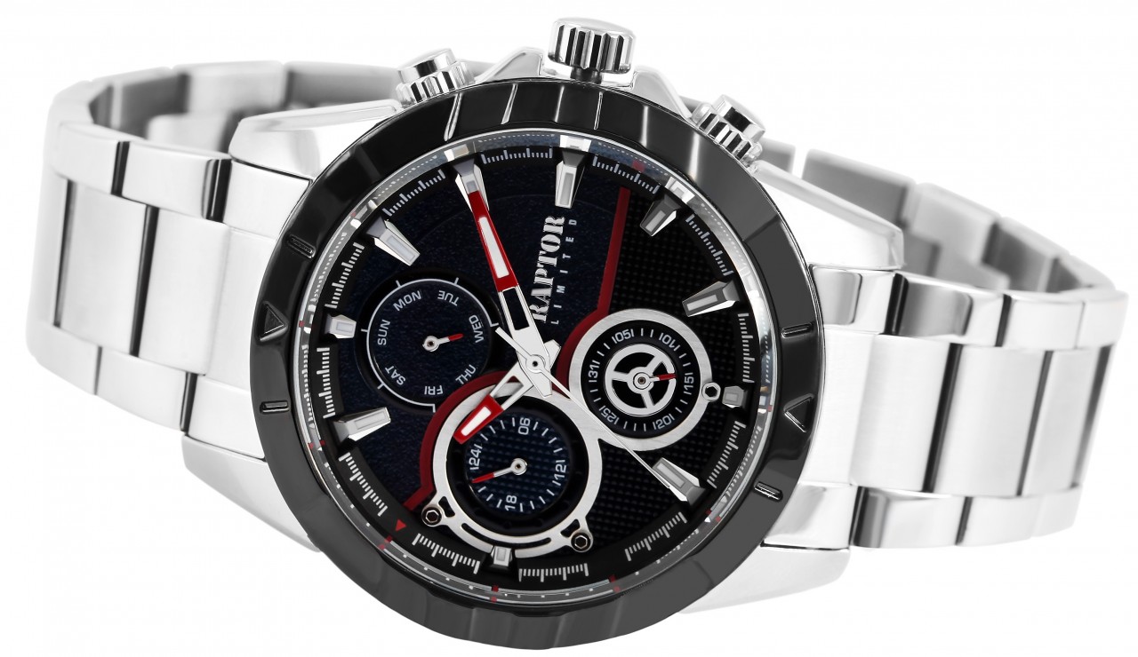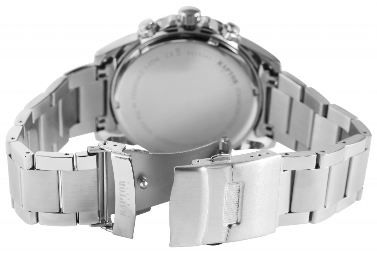O relógio de pulso analógico de 3 ponteiros para homem da marca Raptor apresenta o movimento de quartzo Japan VX7 de alta qualidade e precisão. A bracelete de elos é fabricada em aço inoxidável e tem 22 mm de largura na extremidade. É particularmente robusta e duradoura e pode ser encurtada, se necessário, com uma ferramenta adequada, graças aos elementos amovíveis. A combinação de elementos de relógio mate e brilhantes torna o relógio num acessório especial. A bracelete do relógio pode ser aberta e fechada com um fecho desdobrável em aço inoxidável, incluindo um fecho de segurança, tornando impossível a sua abertura por si só. O comprimento total do relógio é de 23,5 cm. A caixa metálica com vidro mineral tem um diâmetro de 44 mm e uma altura de 13 mm. O fundo da caixa também é feito de aço inoxidável e o relógio tem uma resistência à água de 3 bar.