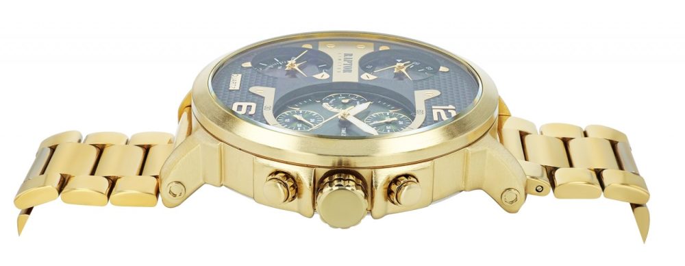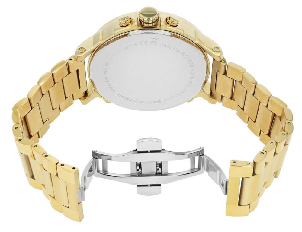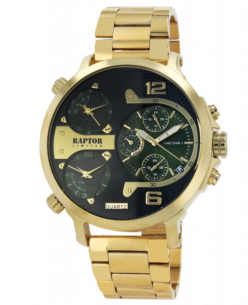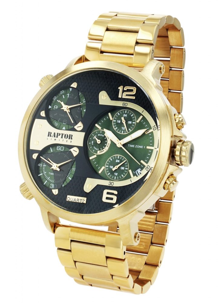 O relógio analógico raptor com bracelete em aço inoxidável com resistência à água de 3 ATM e fecho dobrável em aço inoxidável. Com comprimento total de 23 cm. Largura da Bracelete de 24 mm. Altura da caixa de 13 mm, diâmetro da caixa de 52 mm e material de metal.