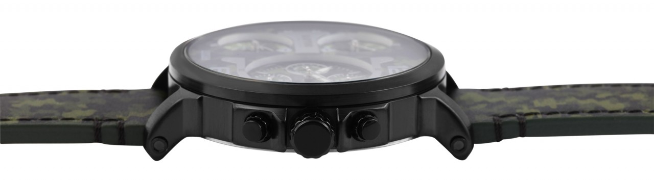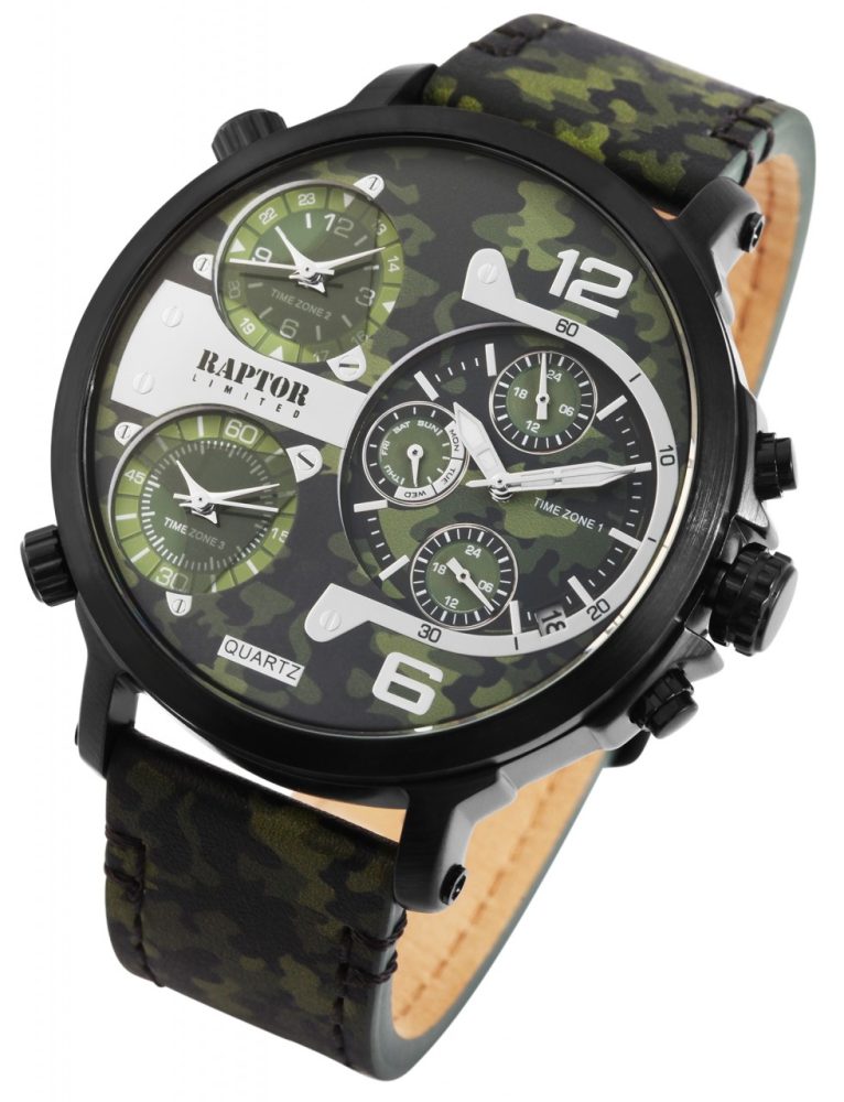 O relógio de pulso multifuncional masculino da marca Raptor possui 3 movimentos de quartzo de alta qualidade. O Miyota JP15 está instalado para o 1º fuso horário, o que significa que além da exibição normal de 12 horas, há uma exibição paralela de 24 horas (exibição superior descentralizada), uma exibição de data (entre 4 e 5 horas) , uma exibição do dia (exibição descentralizada esquerda) e outra exibição separada de 24 horas (exibição descentralizada inferior) decoram o mostrador. Um Miyota 2035 foi usado para o 2º e 3º fusos horários, resultando em duas exibições adicionais de 12 horas. O relógio também foi equipado com uma pulseira de couro genuíno com costuras. Tem 24 mm de largura na alça, diminui até 21 mm à medida que avança e pode ser aberto e fechado usando uma fivela de pino de aço inoxidável preto. O relógio tem um comprimento total de 26 cm. A caixa de metal preto é coberta com vidro mineral…