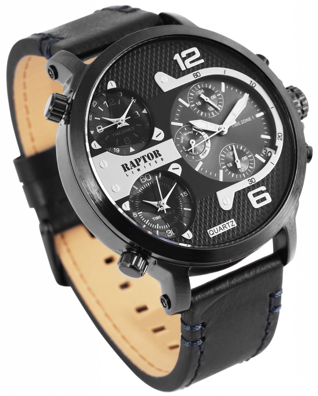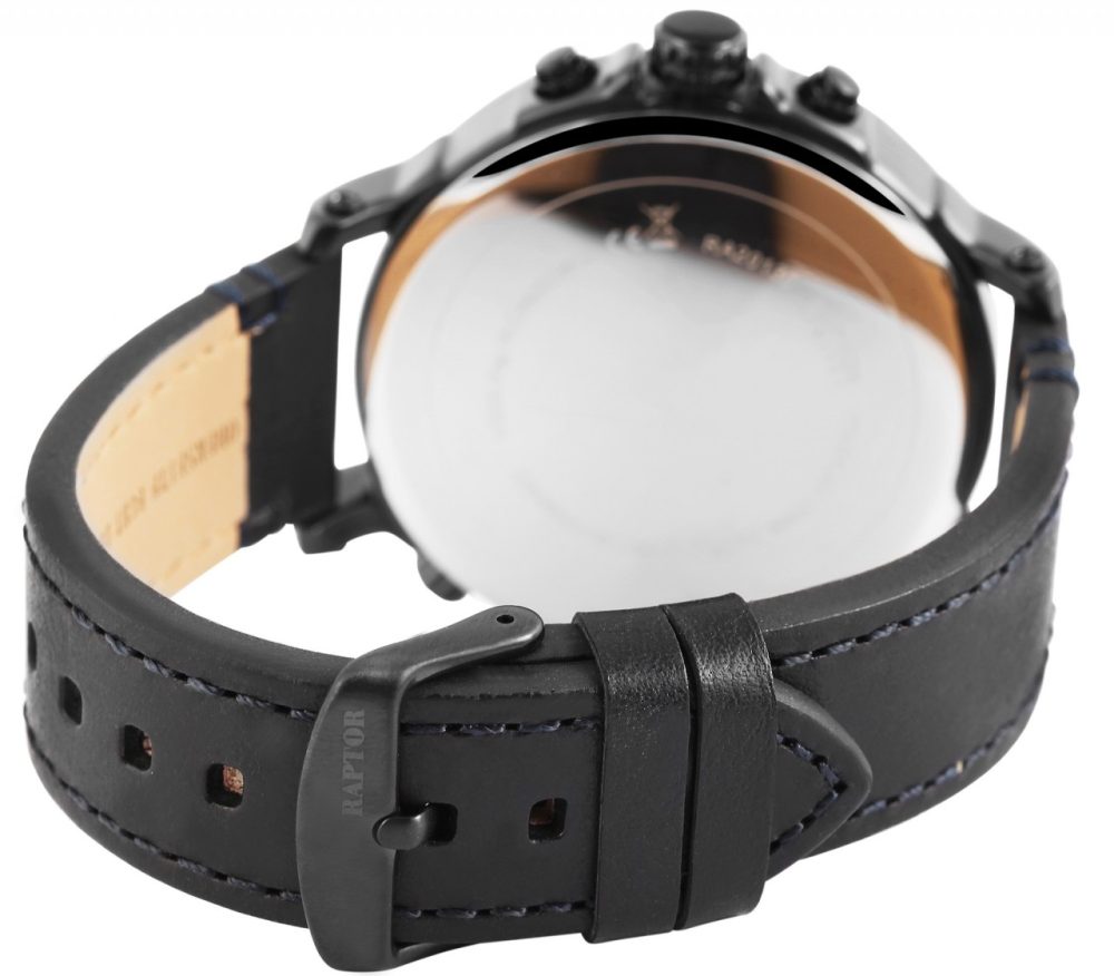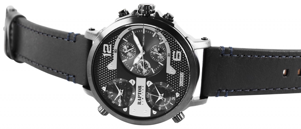 O relógio de pulso multifunções para homem da marca Raptor possui 3 movimentos de quartzo de alta qualidade. O Miyota JP15 é utilizado para o 1º fuso horário, o que significa que, para além da indicação normal de 12 horas, uma indicação paralela de 24 horas (indicação descentralizada superior), uma indicação da data (entre as 4 e as 5 horas), uma indicação do dia (indicação descentralizada esquerda) e uma outra indicação separada de 24 horas (indicação descentralizada inferior) adornam o mostrador. Um Miyota 2035 foi utilizado para cada um dos 2º e 3º fusos horários, resultando em dois mostradores adicionais de 12 horas. O relógio está igualmente equipado com uma bracelete em pele genuína com pespontos. Esta bracelete tem 24 mm de largura na extremidade, desce para 21 mm e pode ser aberta e fechada com uma fivela em aço inoxidável preto. O relógio tem um comprimento total de 26 cm. A caixa em metal preto está equipada com um vidro mineral.