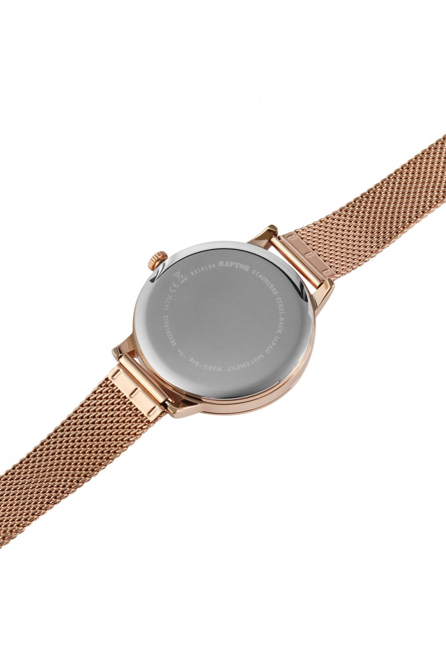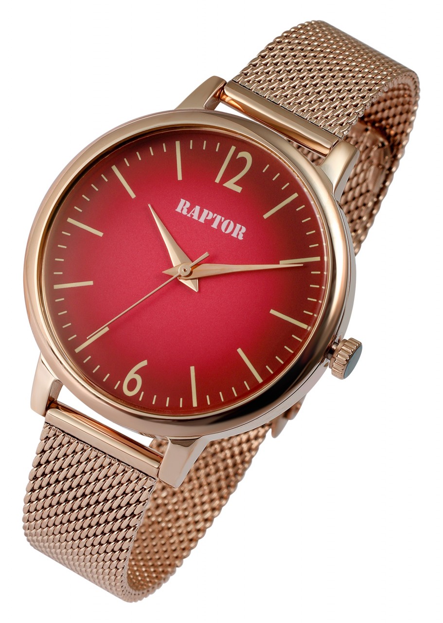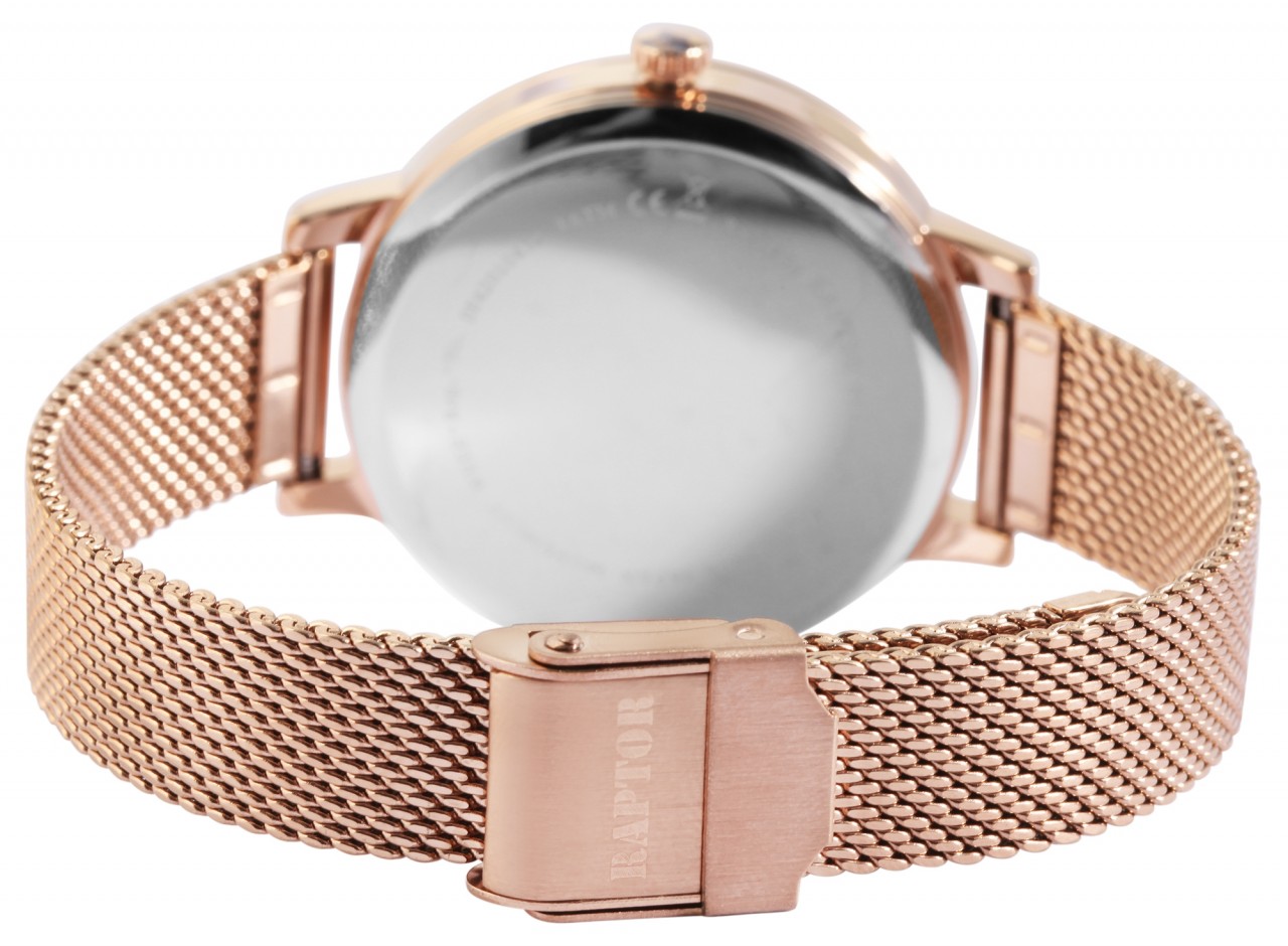 O relógio de pulso analógico da marca Raptor possui um movimento de quartzo de alta qualidade. A bracelete em aço inoxidável tem uma largura de 16 mm e pode ser aberta e fechada com um fecho desdobrável. O comprimento total do relógio é de 21 cm. A caixa metálica com vidro mineral tem um diâmetro de 34 mm e uma altura de 9 mm. O fundo da caixa é feito de aço inoxidável e o relógio tem uma resistência à água de 3 bar. Receberá um cartão de garantia e uma caixa original Raptor como acessórios para o seu produto.