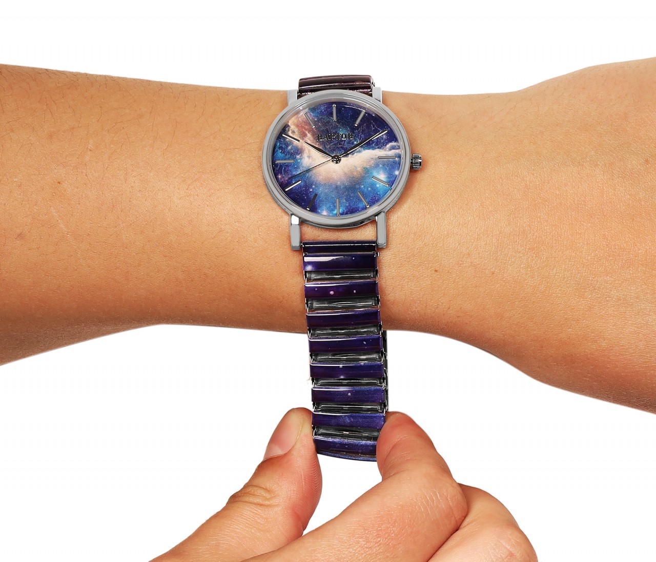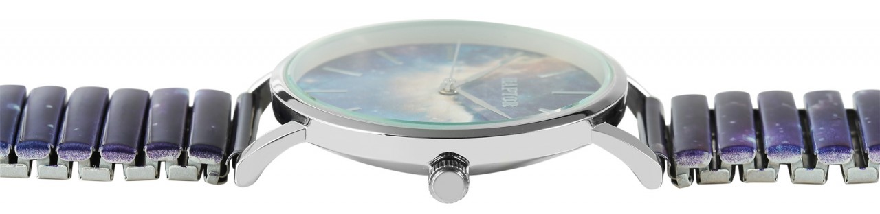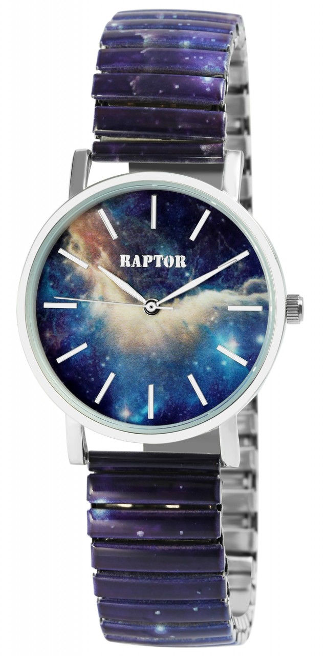 O relógio de pulso feminino analógico de 3 ponteiros da Raptor possui um movimento de quartzo de alta qualidade. A prática pulseira de aço inoxidável tem 18 mm de largura na extremidade e é particularmente fácil de puxar no pulso graças à pulseira flexível. Além disso, o relógio é muito confortável de usar devido à sua leveza e flexibilidade. O comprimento total do relógio é de 18,5 cm. O comprimento da pulseira pode ser ajustado para caber em qualquer pulso. Os elementos podem ser adicionados ou removidos. A caixa redonda de metal com vidro mineral tem um diâmetro de 36 mm e uma altura de 8 mm. O fundo da caixa é feito de aço inoxidável. Cada relógio de pulso é um destaque visual, porque o padrão colorido da pulseira se reflete no mostrador e torna o relógio moderno um atrativo completo. Os ponteiros e os índices das linhas são os mesmos…