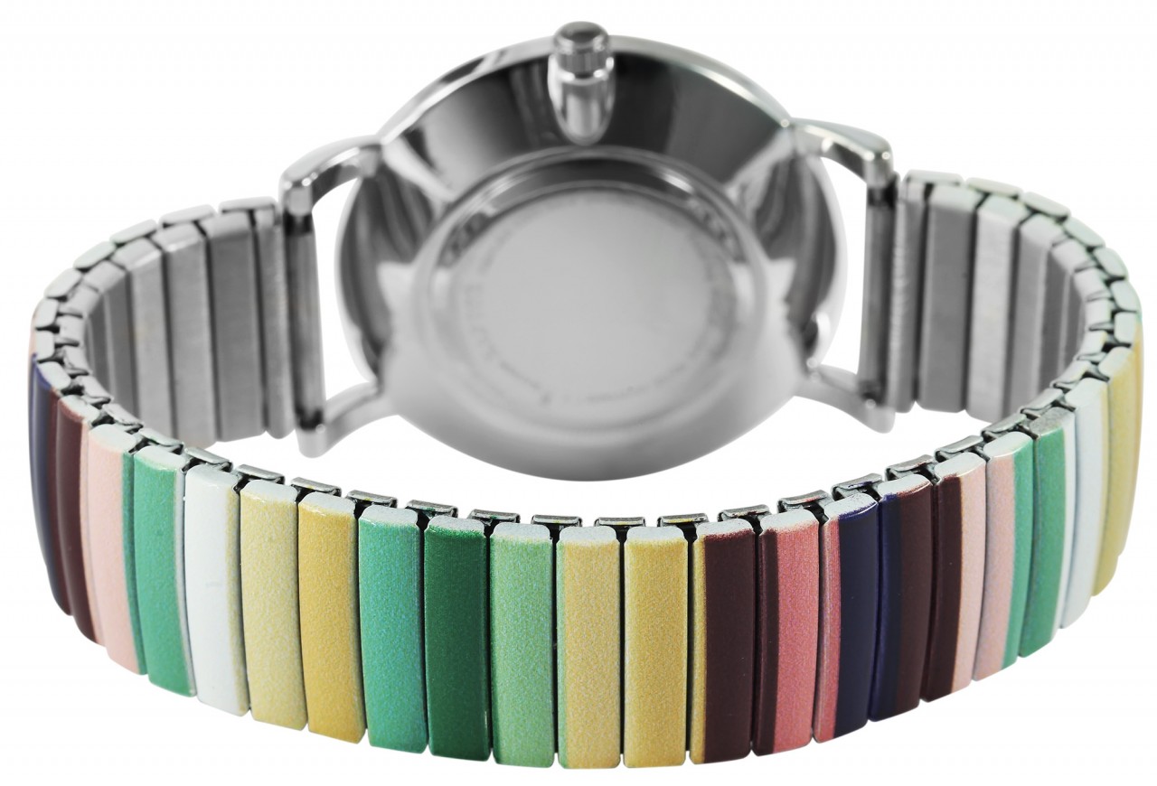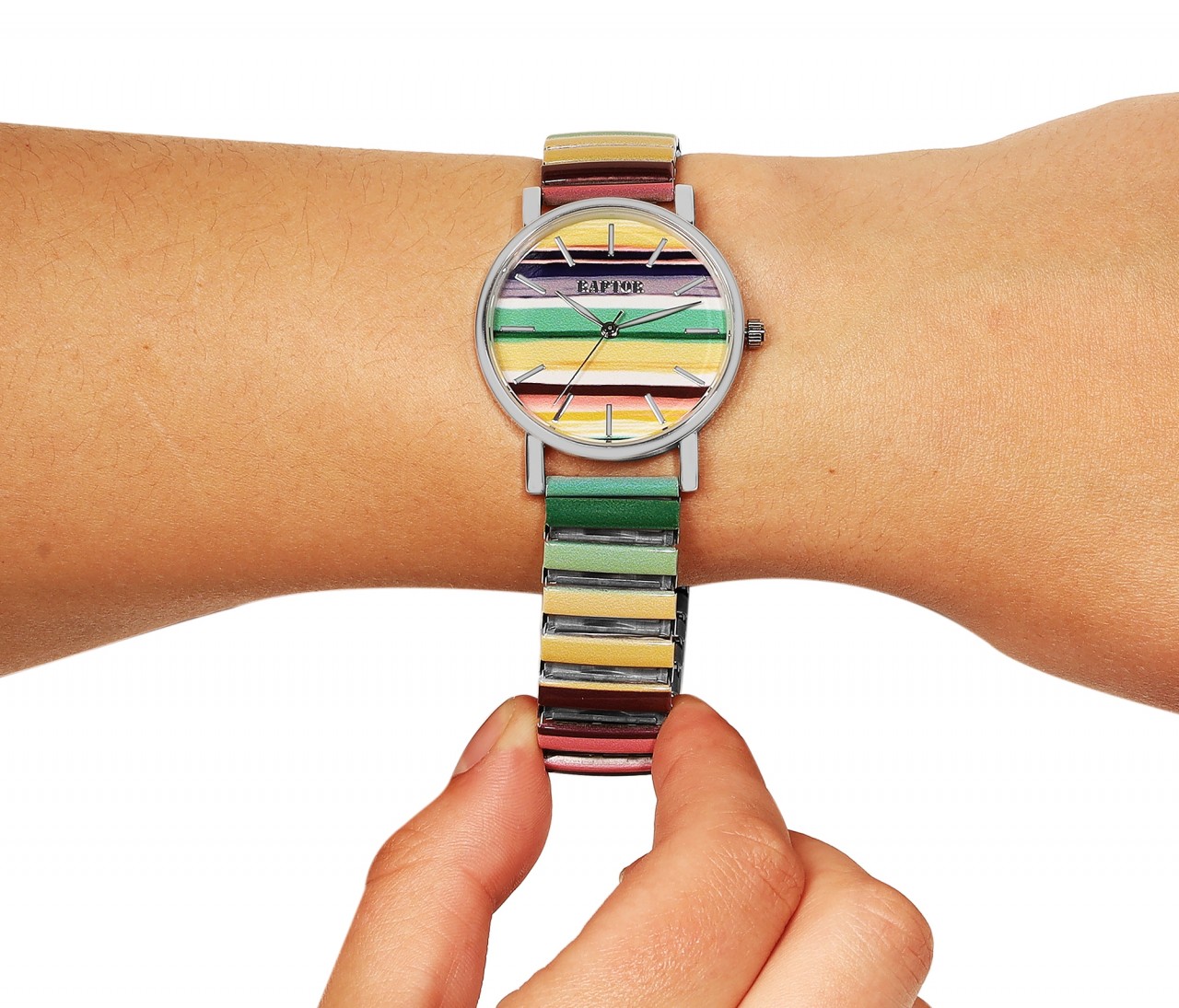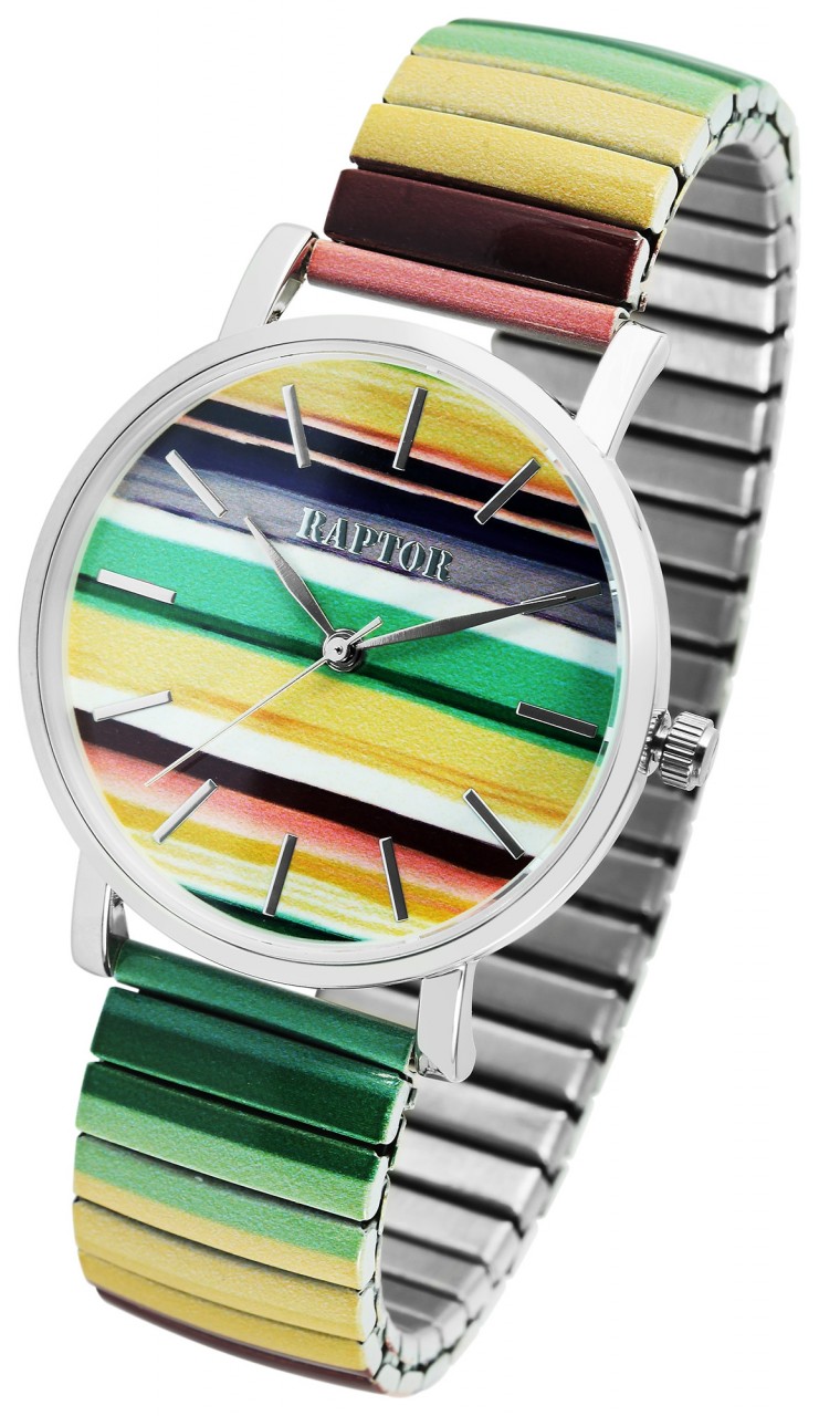 O relógio de pulso feminino analógico de 3 ponteiros da Raptor possui um movimento de quartzo de alta qualidade. A prática pulseira de aço inoxidável tem 18 mm de largura na extremidade e é particularmente fácil de puxar no pulso graças à pulseira flexível. Além disso, o relógio é muito confortável de usar devido à sua leveza e flexibilidade. O comprimento total do relógio é de 18,5 cm. O comprimento da pulseira pode ser ajustado para caber em qualquer pulso. Os elementos podem ser adicionados ou removidos. A caixa redonda de metal com vidro mineral tem um diâmetro de 36 mm e uma altura de 8 mm. O fundo da caixa é feito de aço inoxidável. Cada relógio de pulso é um destaque visual, porque o padrão colorido da pulseira se reflete no mostrador e torna o relógio moderno um atrativo completo. Os ponteiros e os índices das linhas são os mesmos…