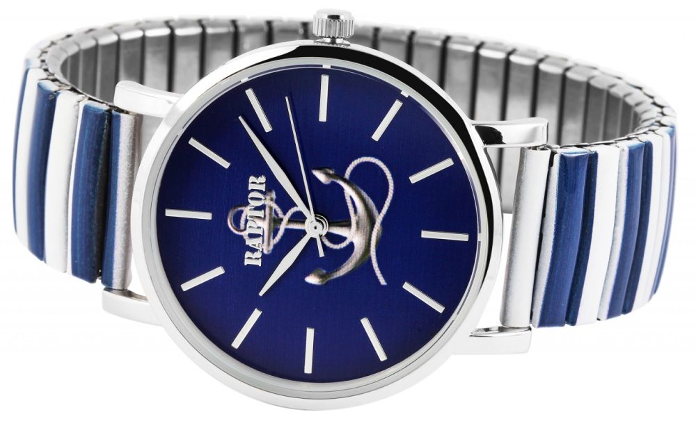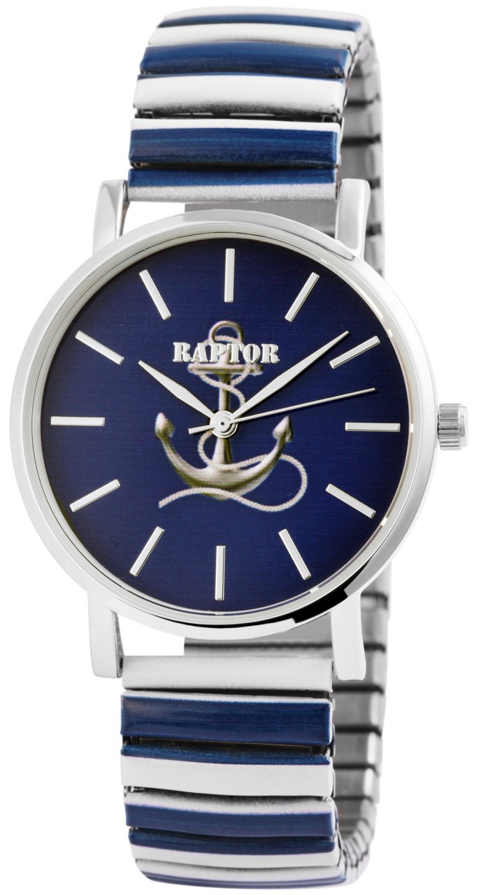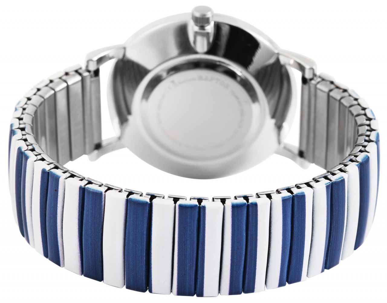O relógio de pulso feminino analógico de 3 ponteiros da Raptor possui um movimento de quartzo de alta qualidade. A prática pulseira de aço inoxidável tem 18 mm de largura na extremidade e é particularmente fácil de puxar no pulso graças à pulseira flexível. Além disso, o relógio é muito confortável de usar devido à sua leveza e flexibilidade. O comprimento total do relógio é de 18,5 cm. O comprimento da pulseira pode ser ajustado para caber em qualquer pulso. Os elementos podem ser adicionados ou removidos. A caixa redonda de metal com vidro mineral tem um diâmetro de 36 mm e uma altura de 8 mm. O fundo da caixa é feito de aço inoxidável. Cada relógio de pulso é um destaque visual, porque o padrão colorido da pulseira se reflete no mostrador e torna o relógio moderno um atrativo completo. Os ponteiros e os índices das linhas são os mesmos…