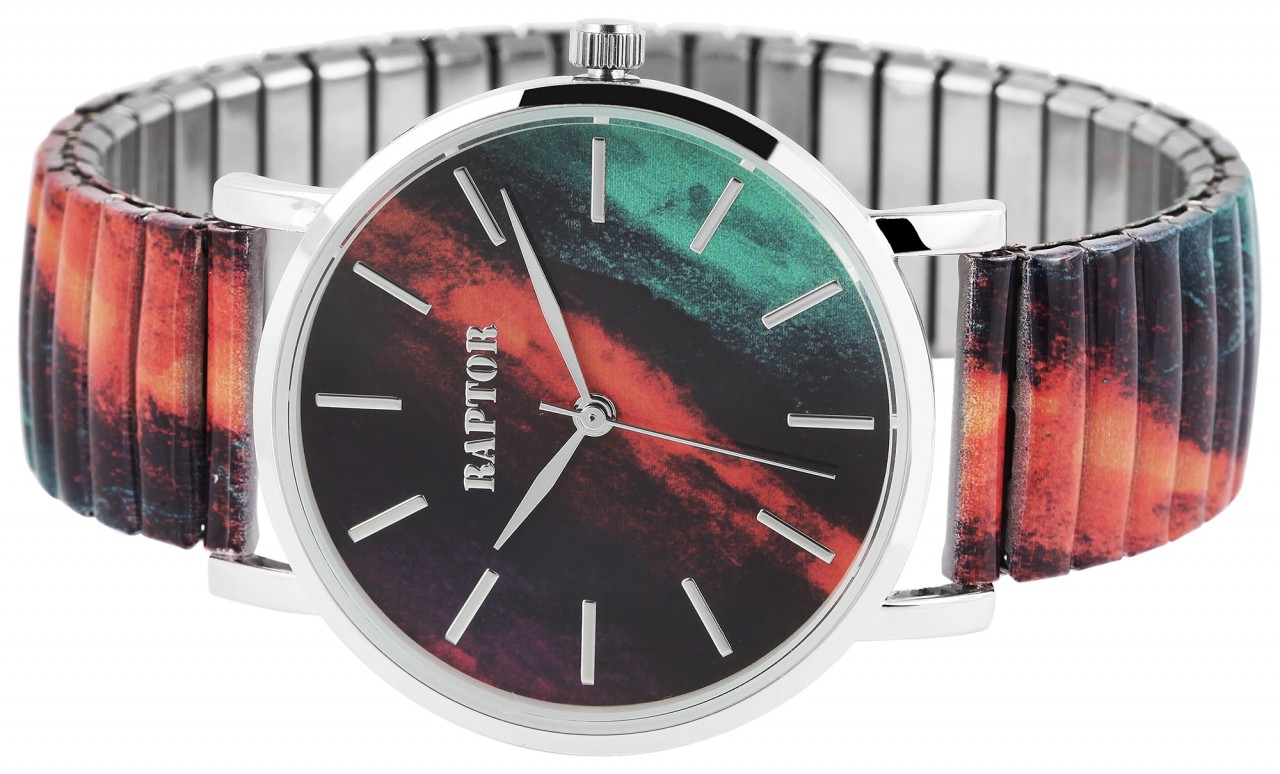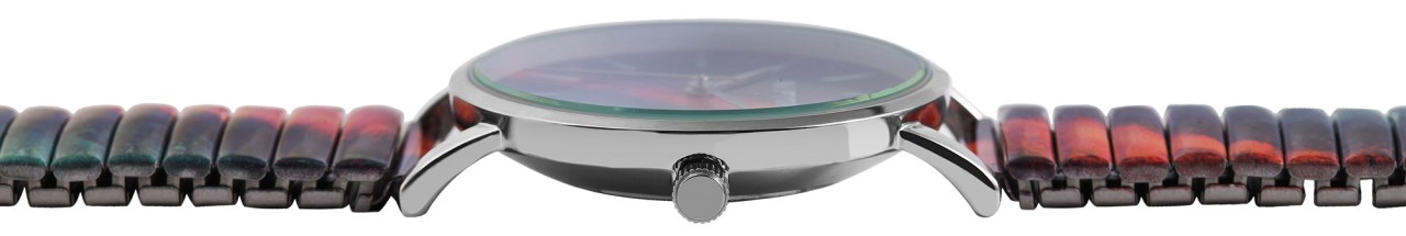 O relógio analógico feminino de 3 ponteiros com pulseira possui um movimento de quartzo de alta qualidade. A pulseira de aço inoxidável tem 18 mm de largura na extremidade e é particularmente fácil de puxar no pulso graças à pulseira flexível. Além disso, o relógio é muito confortável de usar devido à sua leveza e flexibilidade. O comprimento total do relógio é de 18,5 cm. O comprimento da pulseira pode ser ajustado para caber em qualquer pulso. A caixa de metal com vidro mineral tem um diâmetro de 36 mm e uma altura de 8 mm. O fundo da caixa é feito de aço inoxidável. Cada relógio de pulso pull é um destaque visual. O padrão colorido da pulseira é refletido no mostrador e torna o relógio um atrativo completo. Os ponteiros e índices são monocromáticos e combinam bem com a aparência geral do relógio.