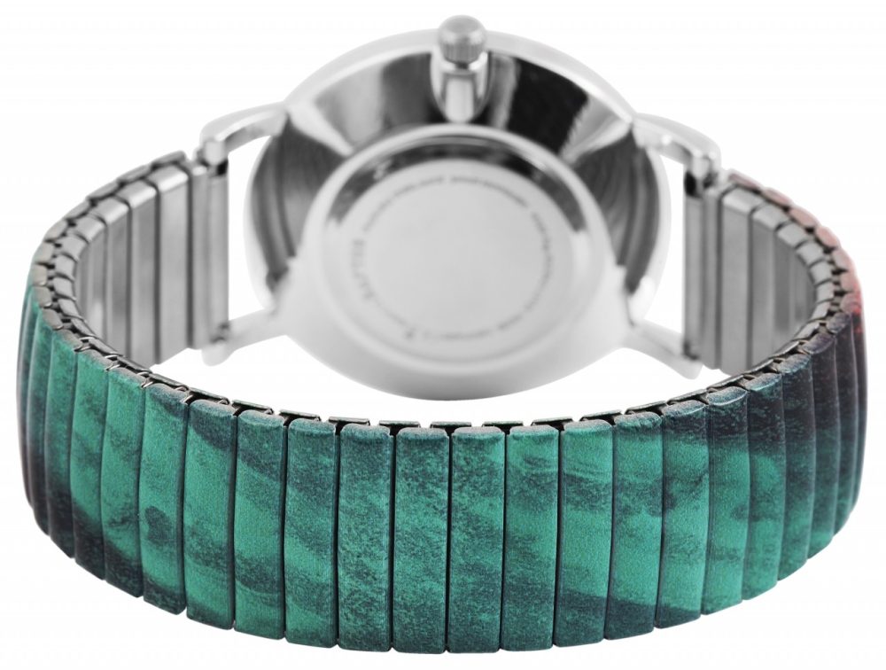 O relógio analógico feminino de 3 ponteiros com pulseira possui um movimento de quartzo de alta qualidade. A pulseira de aço inoxidável tem 18 mm de largura na extremidade e é particularmente fácil de puxar no pulso graças à pulseira flexível. Além disso, o relógio é muito confortável de usar devido à sua leveza e flexibilidade. O comprimento total do relógio é de 18,5 cm. O comprimento da pulseira pode ser ajustado para caber em qualquer pulso. A caixa de metal com vidro mineral tem um diâmetro de 36 mm e uma altura de 8 mm. O fundo da caixa é feito de aço inoxidável. Cada relógio de pulso pull é um destaque visual. O padrão colorido da pulseira é refletido no mostrador e torna o relógio um atrativo completo. Os ponteiros e índices são monocromáticos e combinam bem com a aparência geral do relógio.