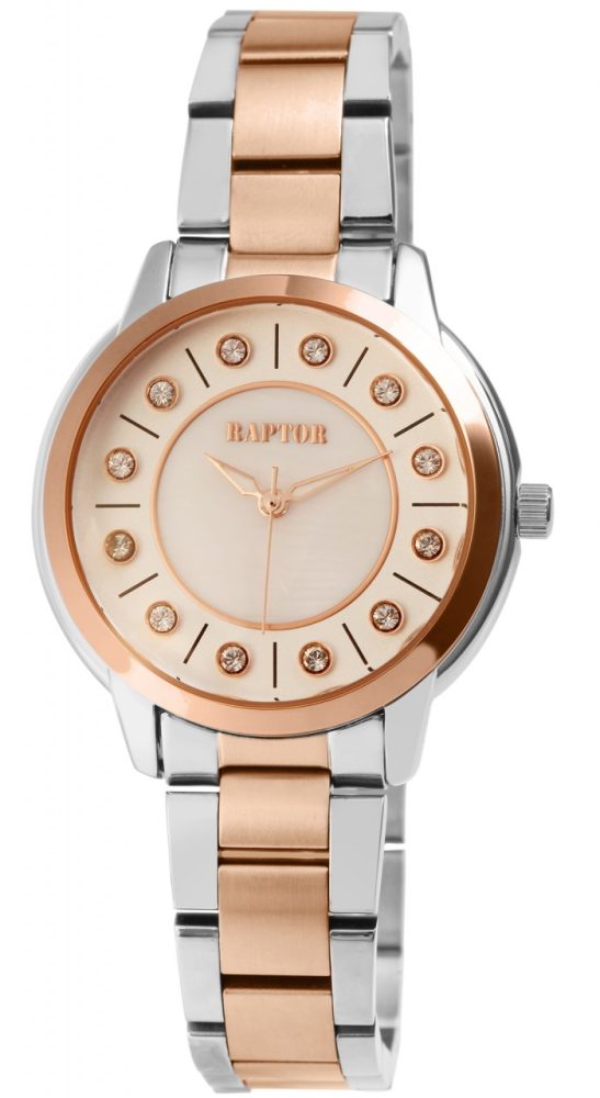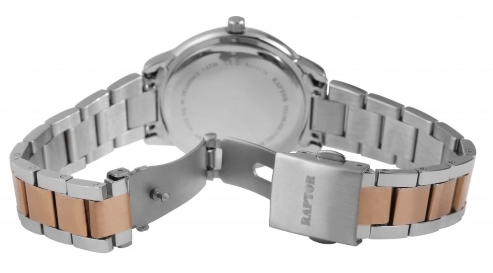 O relógio de pulso feminino analógico de 3 ponteiros da Raptor possui um movimento de quartzo de alta qualidade. A pulseira de aço inoxidável tem 16 mm de largura na alça e pode ser aberta e fechada com um fecho dobrável. O comprimento total do relógio é de 20,5 cm, mas pode ser ajustado conforme desejado graças aos elementos removíveis. O diâmetro da caixa é de 35 mm, a altura da caixa é de 9,5 mm. A tampa da caixa também é feita de aço inoxidável. O relógio também possui resistência à água de 3 ATM. Com este relógio feminino o foco está no mostrador. A bracelete de aço inoxidável brilhante forma uma transição tranquila para caixa do relógio e completa assim o quadro geral.