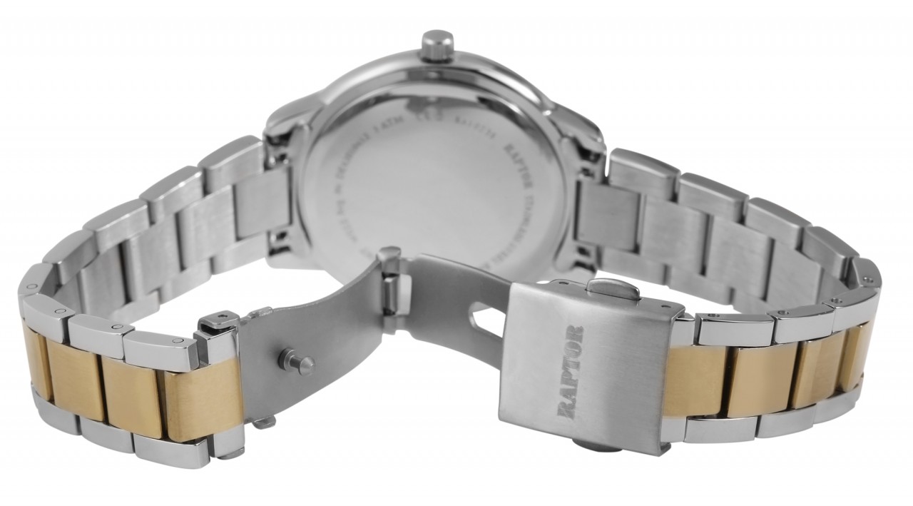 O relógio de pulso feminino analógico de 3 ponteiros da Raptor possui um movimento de quartzo de alta qualidade. A pulseira de aço inoxidável tem 16 mm de largura na alça e pode ser aberta e fechada com um fecho dobrável. O comprimento total do relógio é de 20,5 cm, mas pode ser ajustado conforme desejado graças aos elementos removíveis. O diâmetro da caixa é de 35 mm, a altura da caixa é de 9,5 mm. A tampa da caixa também é feita de aço inoxidável. O relógio também possui resistência à água de 3 ATM. Com este relógio feminino o foco está no mostrador. A bracelete de aço inoxidável brilhante forma uma transição tranquila para caixa do relógio e completa assim o quadro geral.