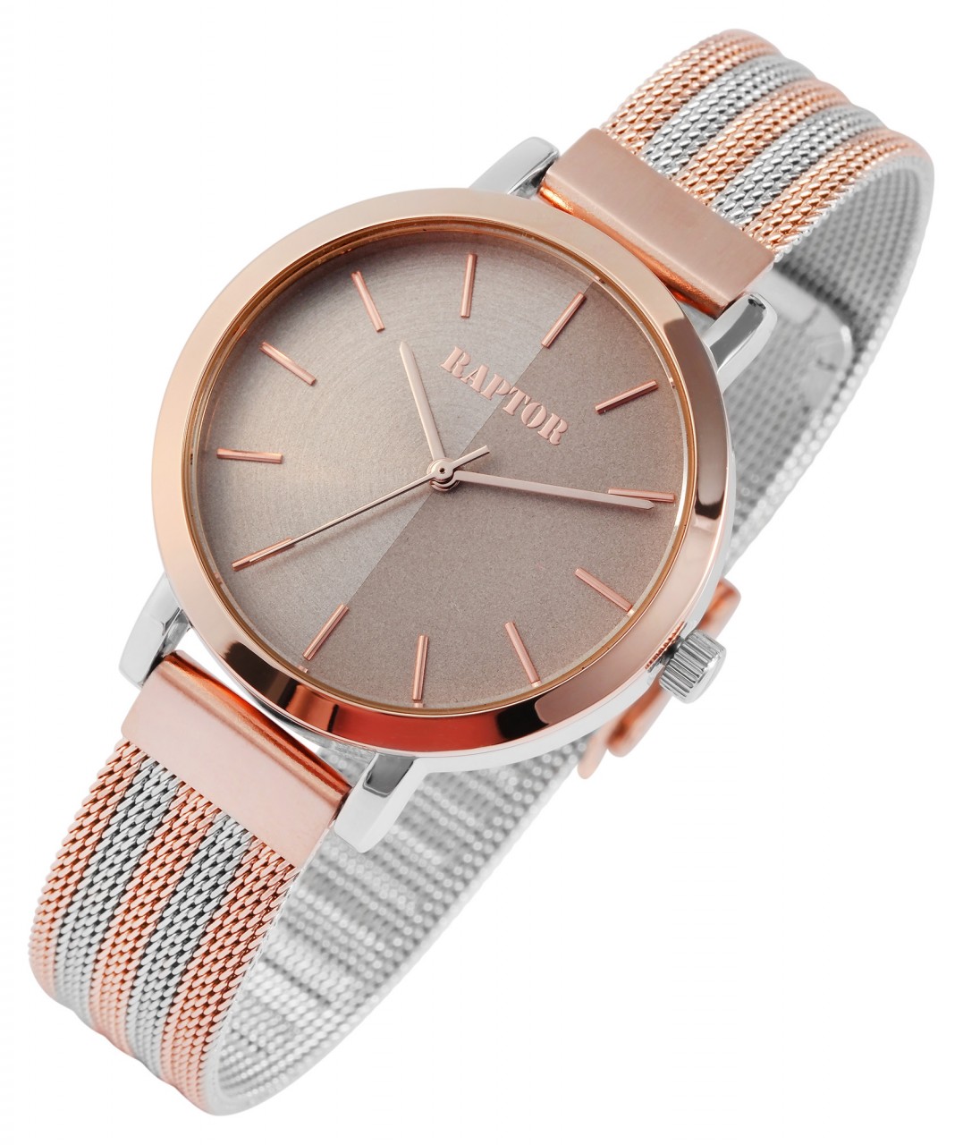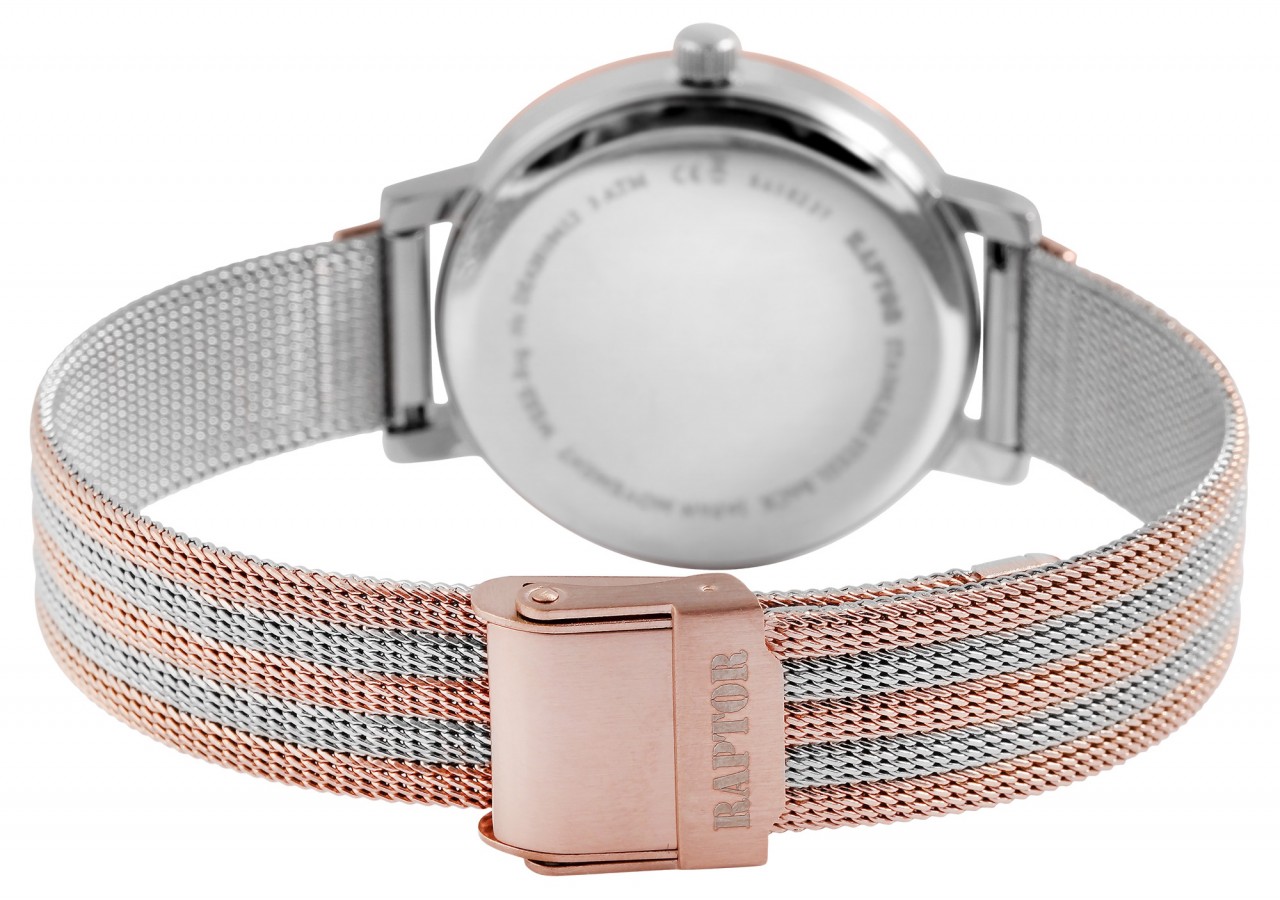 O relógio de pulso feminino analógico de 3 ponteiros da Raptor possui um movimento de quartzo de alta qualidade. A bracelete milanesa em aço inoxidável tem 14 mm de largura na alça e pode ser aberta e fechada usando um fecho de gancho em aço inoxidável com barra de segurança. Graças ao fecho ajustável, o comprimento do relógio pode ser ajustado individualmente a qualquer circunferência do pulso. O comprimento total é de 22 cm. A caixa do relógio feita de metal tem um diâmetro de 34 mm e uma altura de 8 mm. O que chama a atenção no modelo simples é o mostrador, que é visualmente dividido por uma linha vertical. A divisão da caixa é muito simples e a cor combina com o mostrador do relógio e a bracelete, para que a imagem geral seja harmoniosamente arredondada.