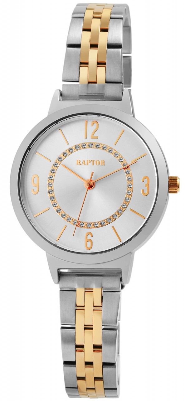 O relógio de pulso feminino analógico de 3 ponteiros da marca Raptor possui o movimento de quartzo Miyota 2035 de alta qualidade e preciso. A pulseira de elos de aço inoxidável tem 14 mm de largura na alça e pode ser aberta e fechada com um fecho dobrável de aço inoxidável. O comprimento total é de 23 cm. A pulseira do relógio é particularmente robusta e durável e pode ser encurtada conforme desejado usando uma ferramenta adequada, graças aos elementos removíveis. A combinação de elementos mate e brilhantes do relógio fazem do relógio um acessório especial. A caixa de aço inoxidável com vidro mineral tem um diâmetro de 36 mm e uma altura de 9 mm. O fundo da caixa também é feito de aço inoxidável e o relógio tem resistência à água de 3 ATM.