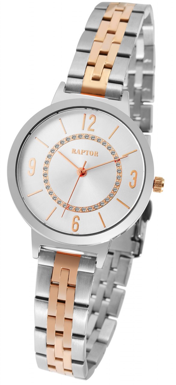 O relógio de pulso feminino analógico de 3 ponteiros da marca Raptor possui o movimento de quartzo Miyota 2035 de alta qualidade e preciso. A pulseira de elos de aço inoxidável tem 14 mm de largura na alça e pode ser aberta e fechada com um fecho dobrável de aço inoxidável. O comprimento total é de 23 cm. A pulseira do relógio é particularmente robusta e durável e pode ser encurtada conforme desejado usando uma ferramenta adequada, graças aos elementos removíveis. A combinação de elementos mate e brilhantes do relógio fazem do relógio um acessório especial. A caixa de aço inoxidável com vidro mineral tem um diâmetro de 36 mm e uma altura de 9 mm. O fundo da caixa também é feito de aço inoxidável e o relógio tem resistência à água de 3 ATM.