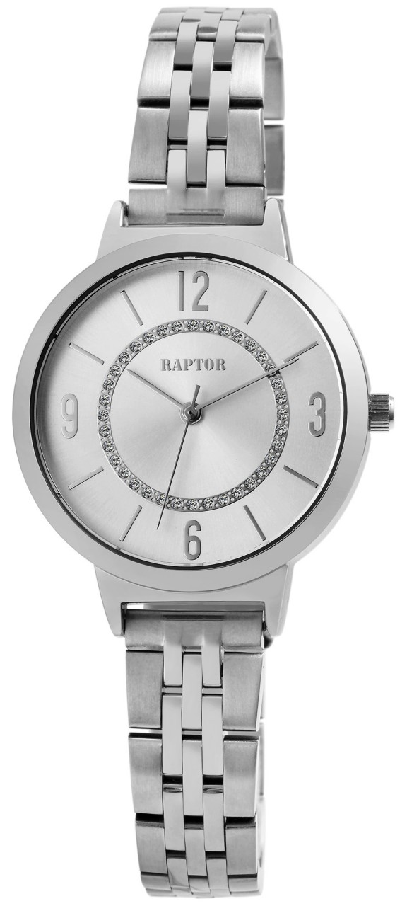 O relógio de pulso feminino analógico de 3 ponteiros da marca Raptor possui o movimento de quartzo Miyota 2035 de alta qualidade e preciso. A bracelete de elos de aço inoxidável tem 14 mm de largura na alça e pode ser aberta e fechada com um fecho dobrável de aço inoxidável. O comprimento total é de 23 cm. A pulseira do relógio é particularmente robusta e durável e pode ser encurtada conforme desejado usando uma ferramenta adequada, graças aos elementos removíveis. A combinação de elementos mate e brilhantes do relógio fazem do relógio um acessório especial. A caixa de aço inoxidável com vidro mineral tem um diâmetro de 36 mm e uma altura de 9 mm. O fundo da caixa também é feito de aço inoxidável e o relógio tem resistência à água de 3 ATM.