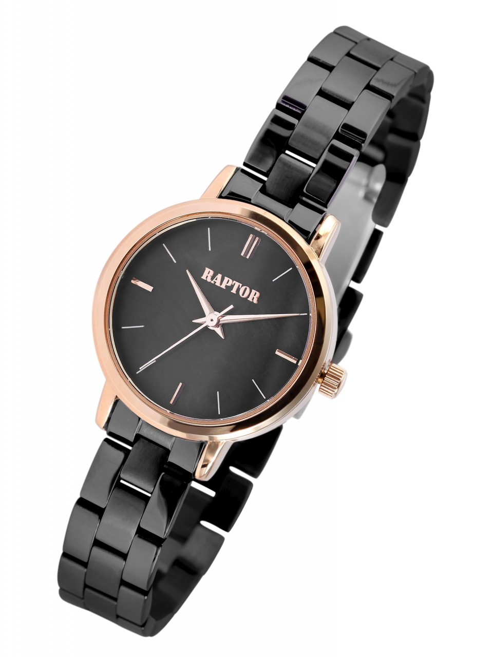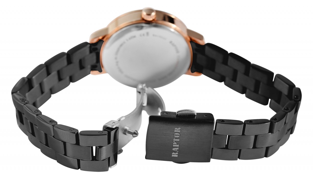 O relógio de pulso feminino analógico de 3 ponteiros da Raptor possui um movimento de quartzo de alta qualidade. A bracelete de aço inoxidável tem uma largura de 12 mm e pode ser aberta e fechada com um fecho dobrável. O comprimento total do relógio é de 18 cm. A caixa de metal com vidro mineral tem um diâmetro de 29 mm e uma altura de 10 mm. O fundo da caixa é feito de aço inoxidável e o relógio tem resistência à água de 3 ATM. O mostrador é feito de madrepérola e brilha em todas as suas facetas. Os ponteiros e índices têm a mesma cor da caixa e assim completam a aparência geral harmoniosa do relógio.