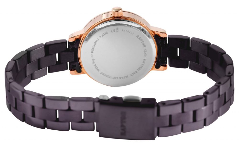 O relógio de pulso feminino analógico de 3 ponteiros da Raptor possui um movimento de quartzo de alta qualidade. A bracelete de aço inoxidável tem uma largura de 12 mm e pode ser aberta e fechada com um fecho dobrável. O comprimento total do relógio é de 18 cm. A caixa de metal com vidro mineral tem um diâmetro de 29 mm e uma altura de 10 mm. O fundo da caixa é feito de aço inoxidável e o relógio tem resistência à água de 3 ATM. O mostrador é feito de madrepérola e brilha em todas as suas facetas. Os ponteiros e índices têm a mesma cor da caixa e assim completam a aparência geral harmoniosa do relógio.