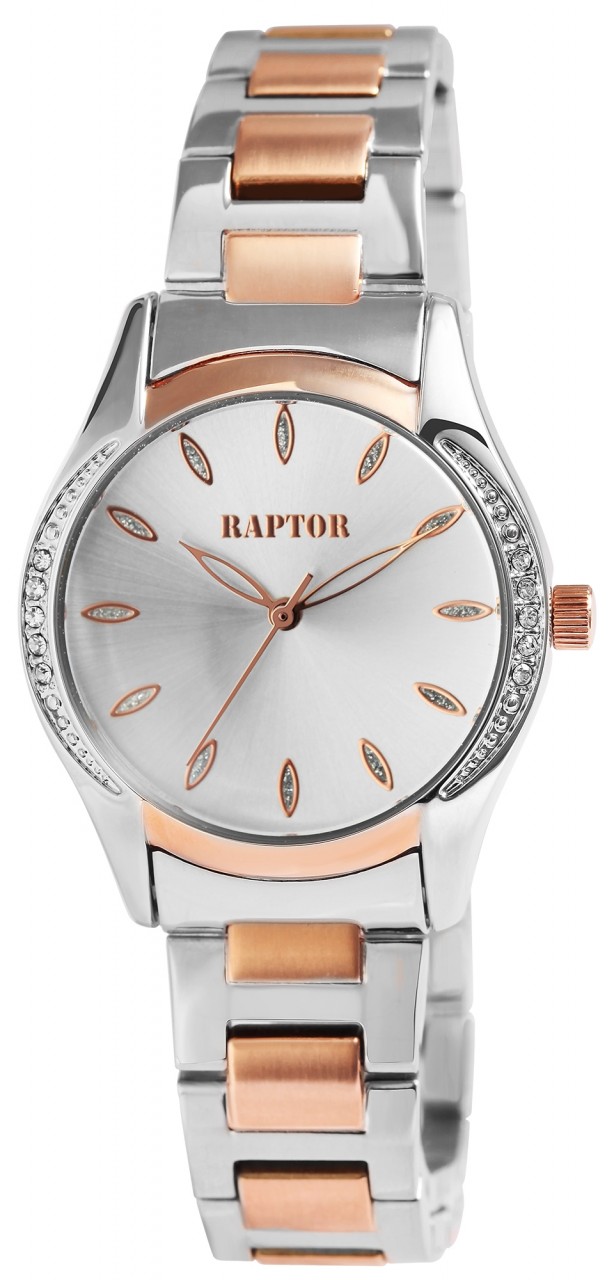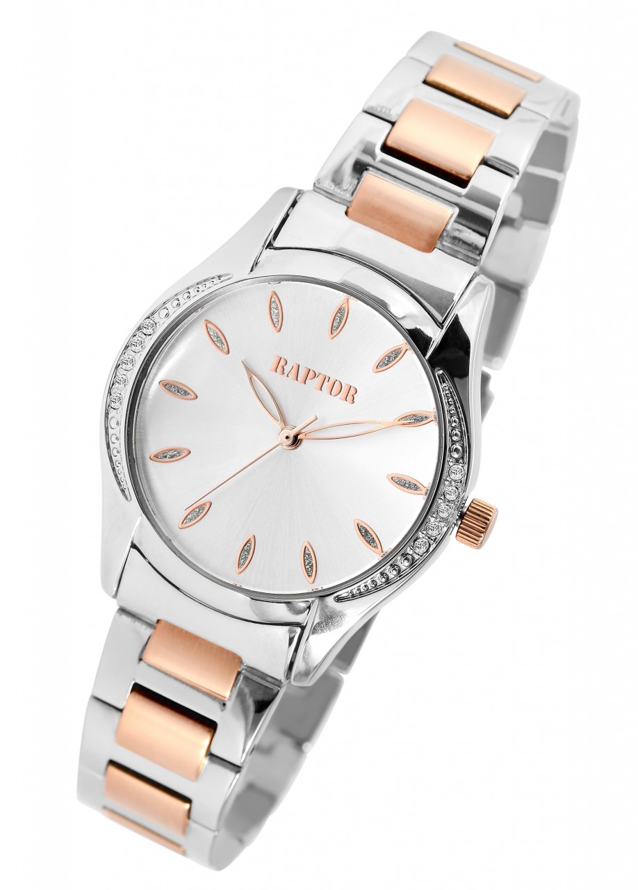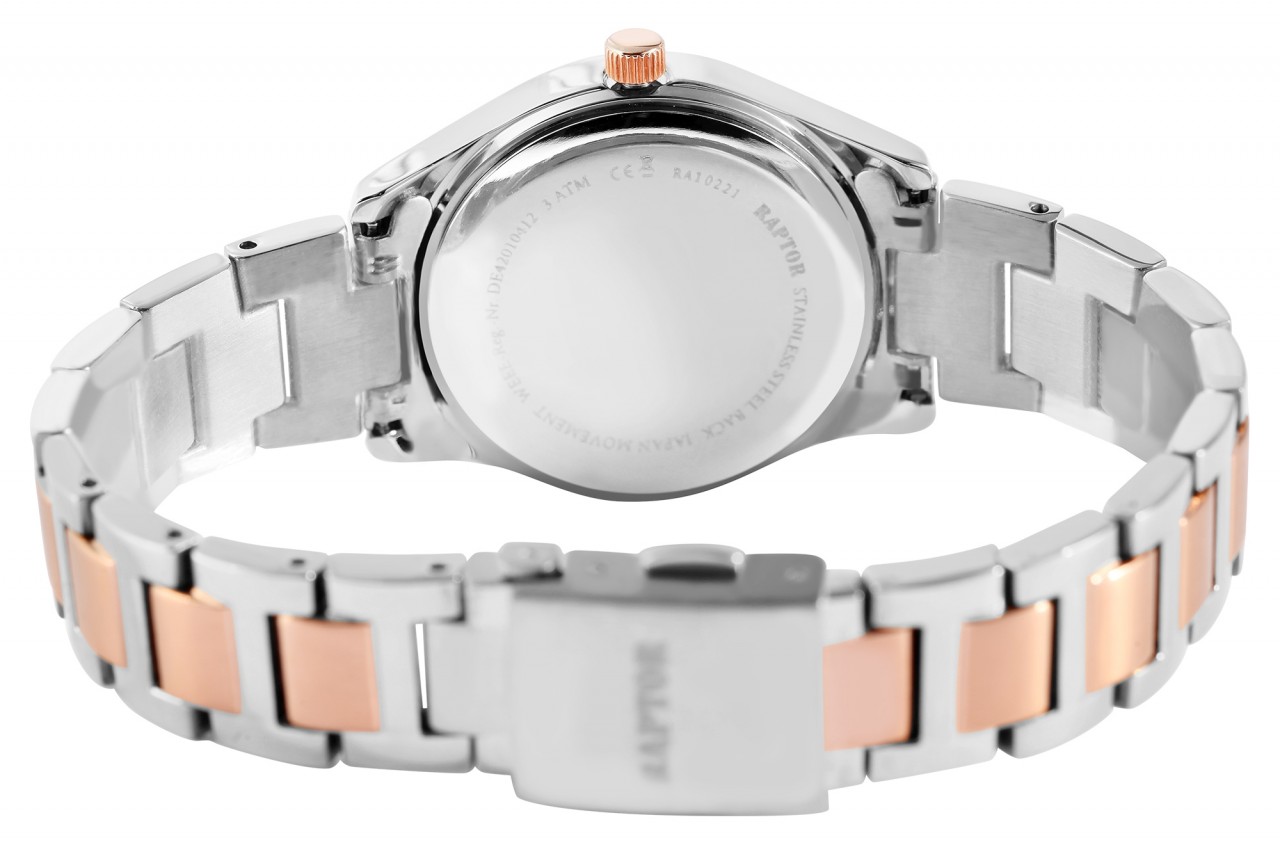 O relógio de pulso feminino analógico de 3 ponteiros da Raptor possui um movimento de quartzo de alta qualidade. A bracelete de aço inoxidável tem uma largura de 16 mm e pode ser aberta e fechada com um fecho dobrável. O comprimento total do relógio é de 18 cm. A caixa de metal com vidro mineral tem um diâmetro de 32 mm e uma altura de 10 mm. O fundo da caixa é feito de aço inoxidável e o relógio tem resistência à água de 3 ATM. O mostrador é claro e simples. Pedras semelhantes em forma de folha servem como índices de pontos, que também são refletidos na caixa do relógio. Os ponteiros e índices têm a mesma cor da caixa e assim completam a aparência geral harmoniosa do relógio.