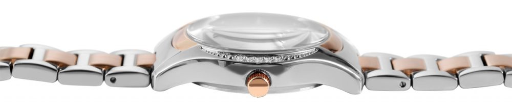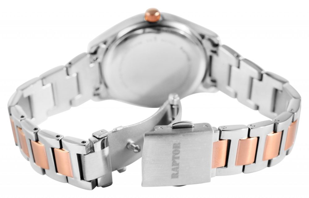O relógio de pulso feminino analógico de 3 ponteiros da Raptor possui um movimento de quartzo de alta qualidade. A bracelete de aço inoxidável tem uma largura de 16 mm e pode ser aberta e fechada com um fecho dobrável. O comprimento total do relógio é de 18 cm. A caixa de metal com vidro mineral tem um diâmetro de 32 mm e uma altura de 10 mm. O fundo da caixa é feito de aço inoxidável e o relógio tem resistência à água de 3 ATM. O mostrador é claro e simples. Pedras semelhantes em forma de folha servem como índices de pontos, que também são refletidos na caixa do relógio. Os ponteiros e índices têm a mesma cor da caixa e assim completam a aparência geral harmoniosa do relógio.