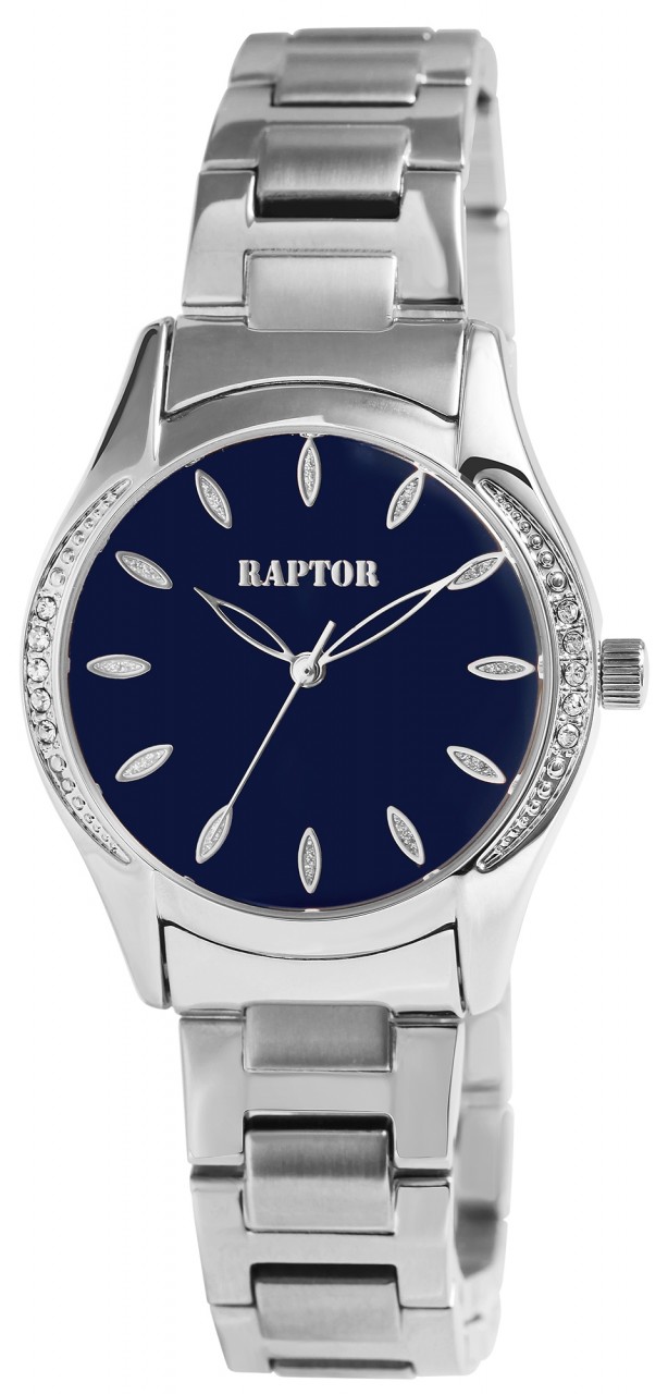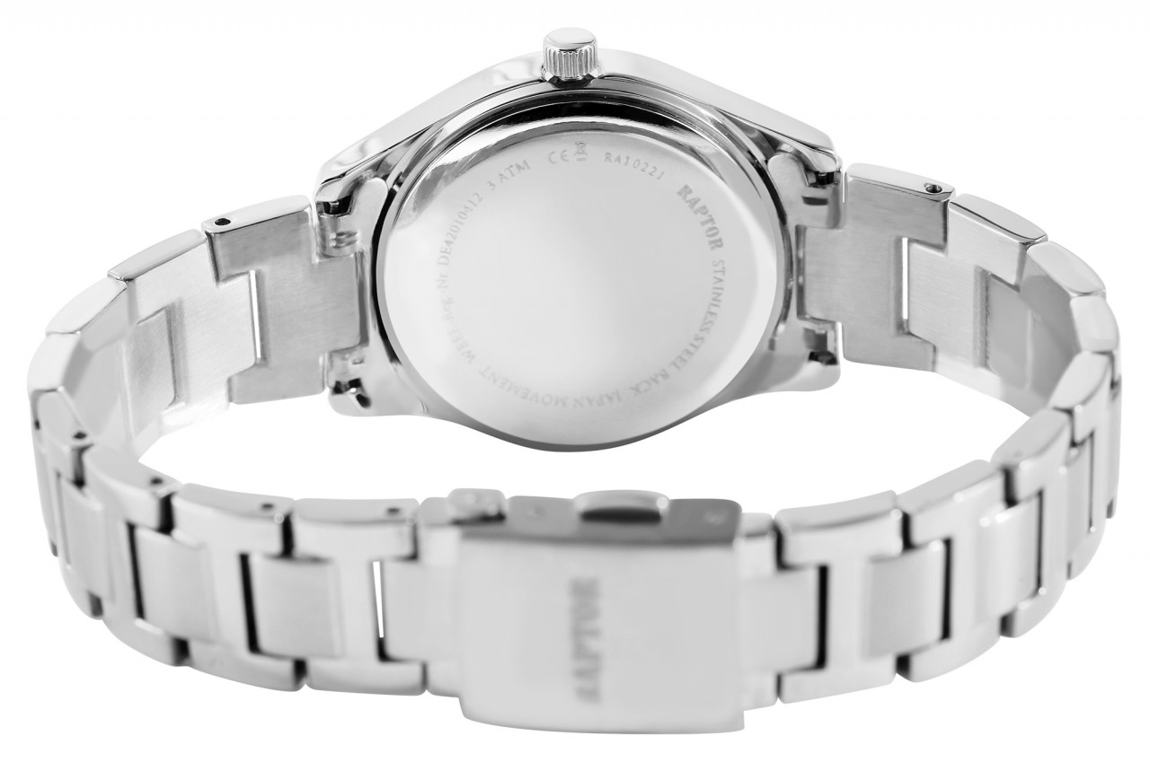 O relógio de pulso feminino analógico de 3 ponteiros da Raptor possui um movimento de quartzo de alta qualidade. A bracelete de aço inoxidável tem uma largura de 16 mm e pode ser aberta e fechada com um fecho dobrável. O comprimento total do relógio é de 18 cm. A caixa de metal com vidro mineral tem um diâmetro de 32 mm e uma altura de 10 mm. O fundo da caixa é feito de aço inoxidável e o relógio tem resistência à água de 3 bar. O mostrador é claro e simples. Pedras semelhantes em forma de folha servem como índices de pontos, que também são refletidos na caixa do relógio. Os ponteiros e índices têm a mesma cor da caixa e assim completam a aparência geral harmoniosa do relógio. Como acessórios do seu produto, você receberá um cartão de garantia e uma caixa original da marca Raptor.