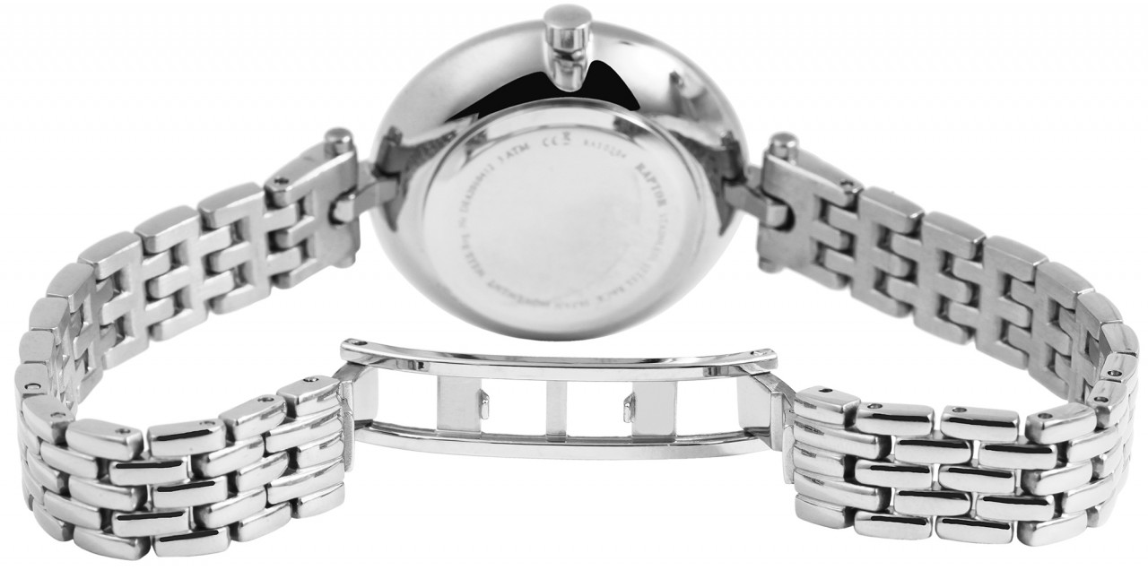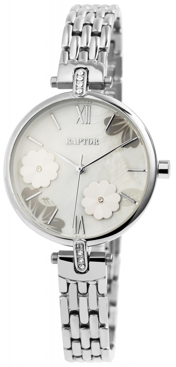 O relógio de pulso feminino analógico da marca Raptor “Malva” possui o movimento de quartzo Miyota 2035 de alta qualidade. A bracelete de aço inoxidável tem 10 mm de largura. O relógio tem comprimento total de 20 cm. A caixa de aço inoxidável está equipada com vidro mineral. Mede 32 mm de diâmetro e 10 mm de altura. O fundo da caixa é feito de aço inoxidável.