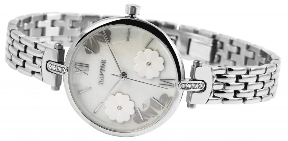 O relógio de pulso feminino analógico da marca Raptor “Malva” possui o movimento de quartzo Miyota 2035 de alta qualidade. A bracelete de aço inoxidável tem 10 mm de largura. O relógio tem comprimento total de 20 cm. A caixa de aço inoxidável está equipada com vidro mineral. Mede 32 mm de diâmetro e 10 mm de altura. O fundo da caixa é feito de aço inoxidável.