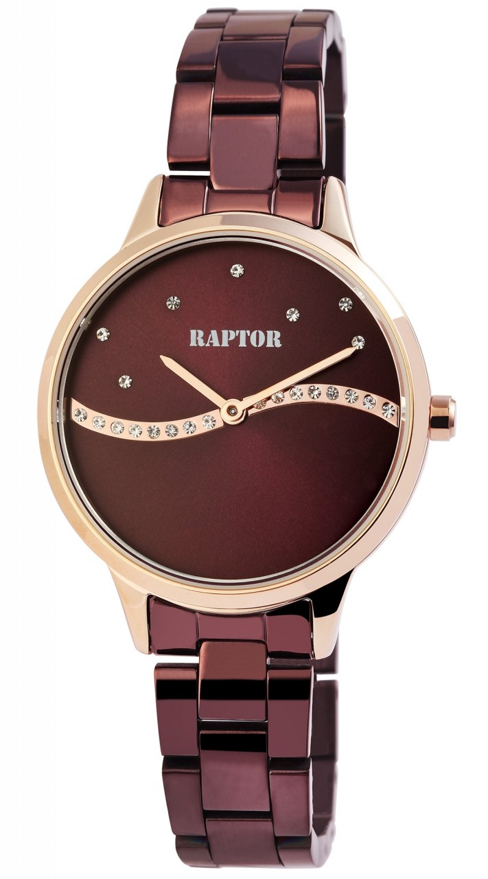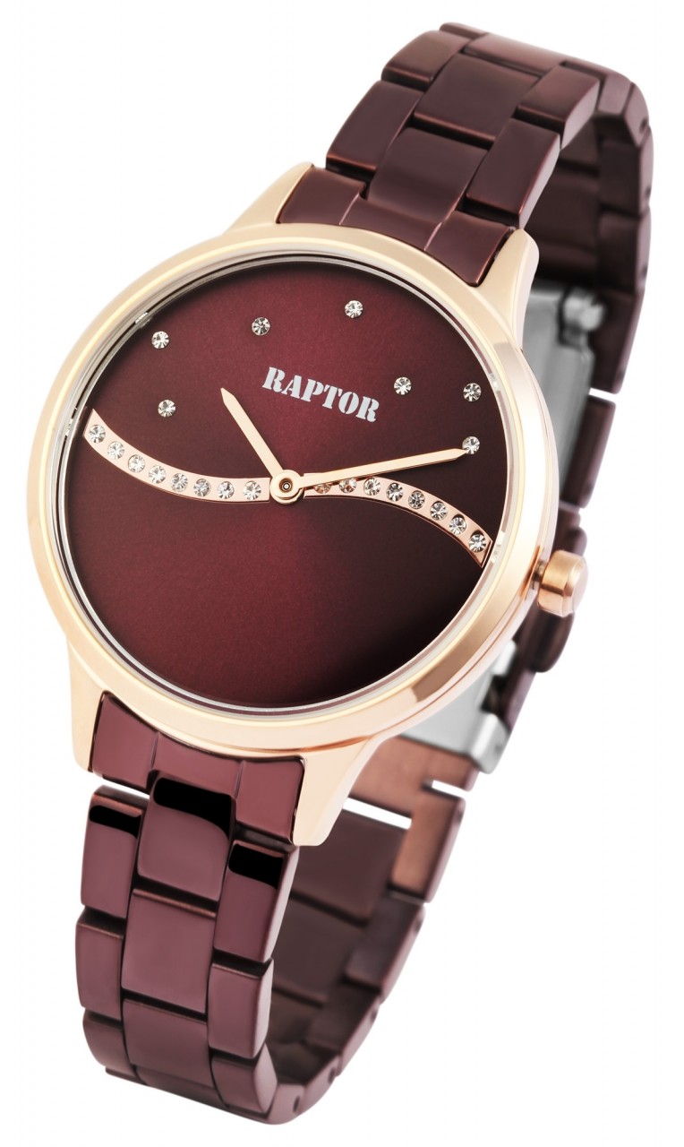 O relógio de pulso feminino analógico de 3 ponteiros da marca Raptor possui o movimento de quartzo Miyota Y120 de alta qualidade. A bracelete em aço inoxidável tem 14 mm de largura na alça e pode ser aberta e fechada com um fecho dobrável em aço inoxidável. O comprimento total do relógio é de 21 cm. A caixa de metal com vidro mineral tem um diâmetro de 34 mm e uma altura de 9 mm. Um destaque especial é o mostrador, que apresenta uma fina onda de pedras brilhantes que o atravessam. Acima da onda de glitter há strass colocados individualmente. O fundo da caixa é feito de aço inoxidável.